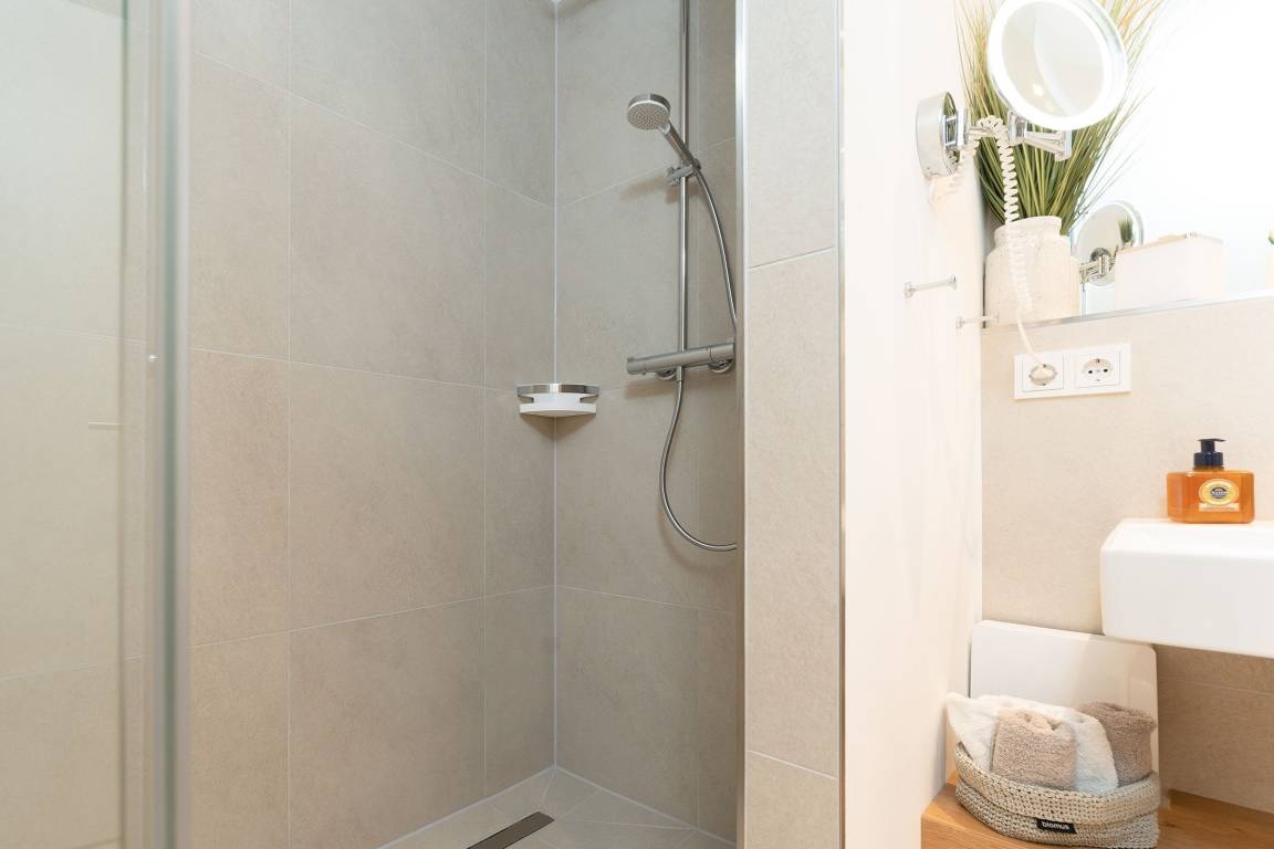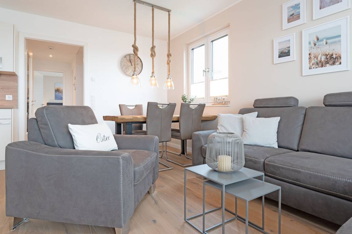 Hell, modern und in maritimem Chic empfängt Sie der offene Wohnbereich mit gemütlicher Couch, die bei Bedarf in einen weiteren Schlafplatz (120x230 cm) verwandelt werden kann. In der hochwertigen Küche, die mit allen Annehmlichkeiten ausgestattet ist, bereitet Ihnen das Zubereiten der Mahlzeiten bestimmt besonders viel Freude. Nehmen Sie Platz am großzügigen Esstisch und planen Sie gemeinsam den kommenden Urlaubstag. Genießen Sie zahlreiche Sonnenstunden auf der möblierten Terrasse und machen Sie es sich im windgeschützten Strandkorb gemütlich - untermalt vom Rauschen der Ostsee. Im Erdgeschoss befindet sich neben dem Gäste-WC außerdem eines der beiden Schlafzimmer, das Sie mit einem luxuriösen Boxspringbett (ca. 180x200cm) empfängt. Das zweite Schlafzimmer mit Bad en Suite erwartet Sie im Souterrain, ebenfalls mit einem großen Boxspringbett (ca. 180x200cm). Das Badezimmer mit ebenerdiger Dusche und Doppelwaschtisch vermittelt Wellness-Feeling. Zur Nacht lassen sich alle Zimmer angenehm abdunkeln.