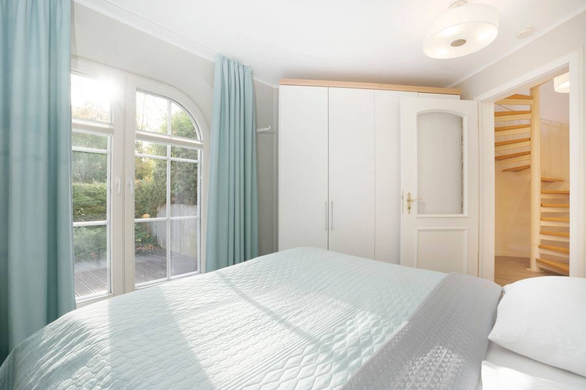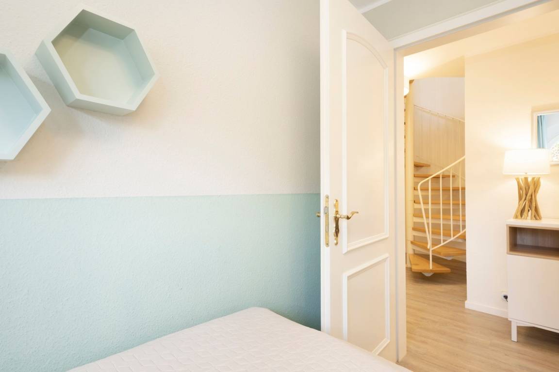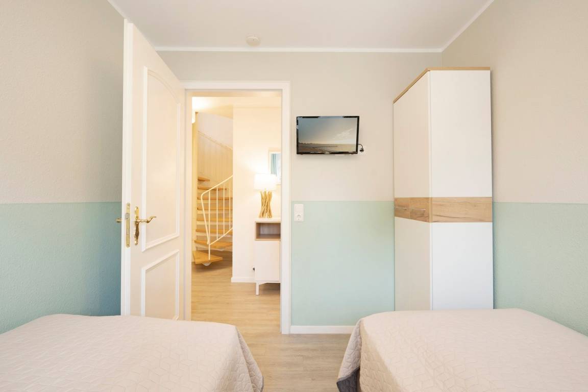 Die obere Ebene umfasst ein Wohnzimmer mit einer Schlafcouch (ca. 160x195 cm) für zwei Personen sowie einer gut ausgestatteten Küchenzeile mit einem Essbereich. Hier finden Sie auch ein Gäste-WC. Über eine Wendeltreppe gelangen Sie in die untere Ebene. Dort gibt es zwei Schlafzimmer: Ein Schlafzimmer mit einem Doppelbett (2x 90x200 cm) und ein Schlafzimmer mit zwei einzelnen Boxspringbetten (je 90x200 cm) und zweitem TV-Gerät. Hier finden Sie auch ein modernes Duschbad mit Fenster. Die Wohnung verfügt über einen Balkon und eine Terrasse.