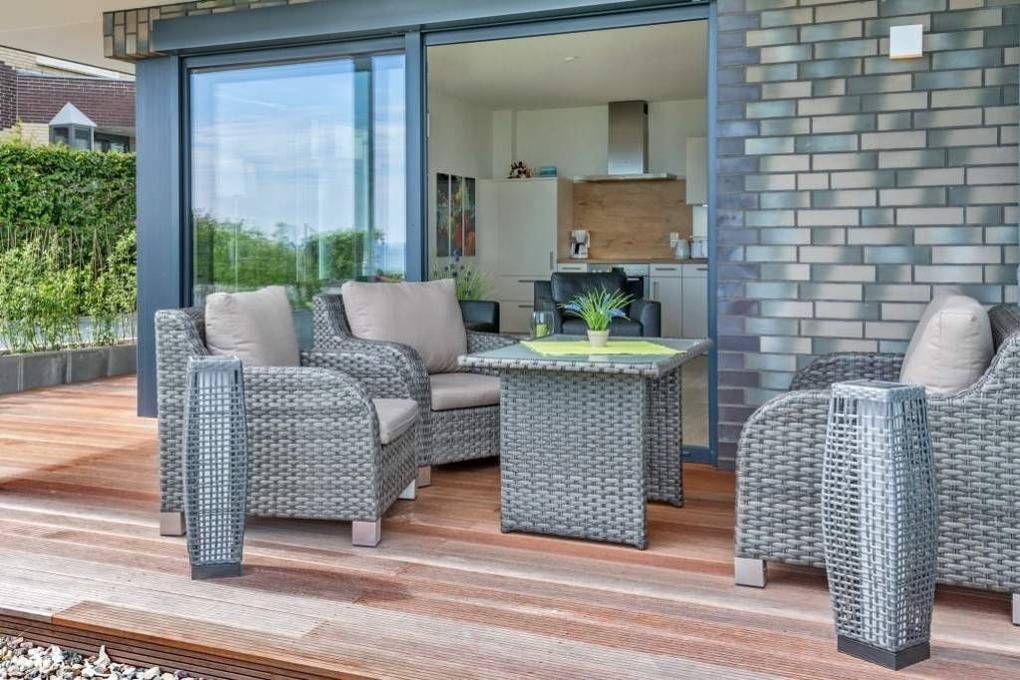 Eine 75 m² große, 3-Zimmer-Ferienwohnung mit Holz-Terrasse, 100 % Meerblick, Duschbad, Gäste-WC, Kfz-Außenstellplatz, für bis zu 4 Personen.