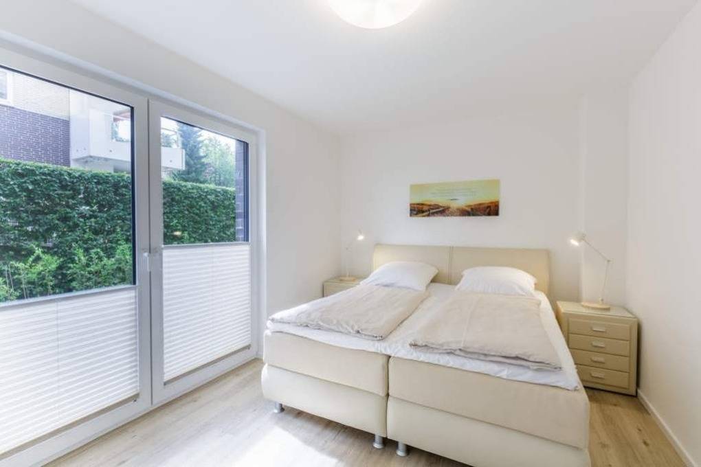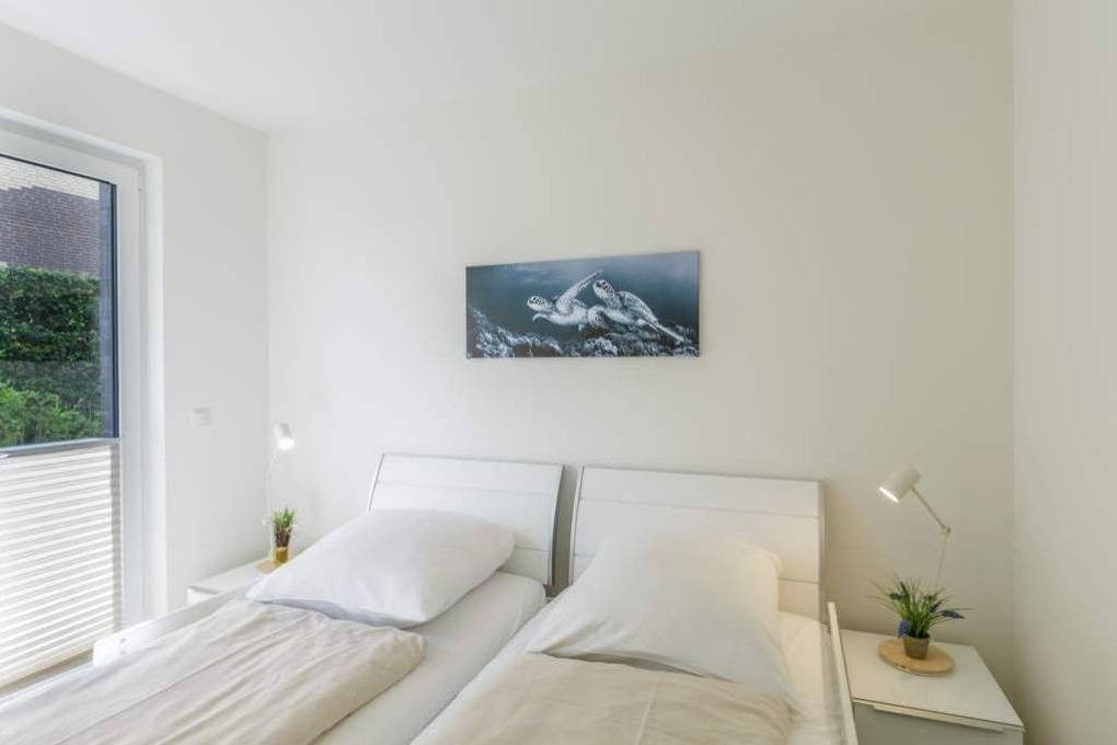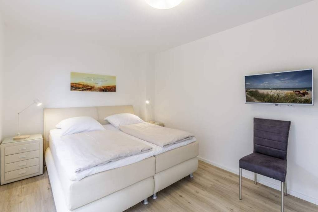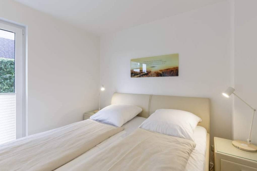 Das erste Schlafzimmer ist mit einem Boxspringbett (180 x 200m), das zweite Schlafzimmer mit zwei Einzelbetten (90 x 200m) und je einem Flach-TV sowie einem Kleiderschrank ausgestattet. Durch die Außenrollläden können Sie auf Ihren Wunsch die Schlafzimmer verdunkeln, ganz so, wie Sie es möchten. Das Badezimmer hat Tageslicht, eine bodengleiche Dusche, Handtuchheizkörper und Fußbodenheizung. Ein Tageslicht-Gäste-WC steht ebenfalls zur Verfügung.