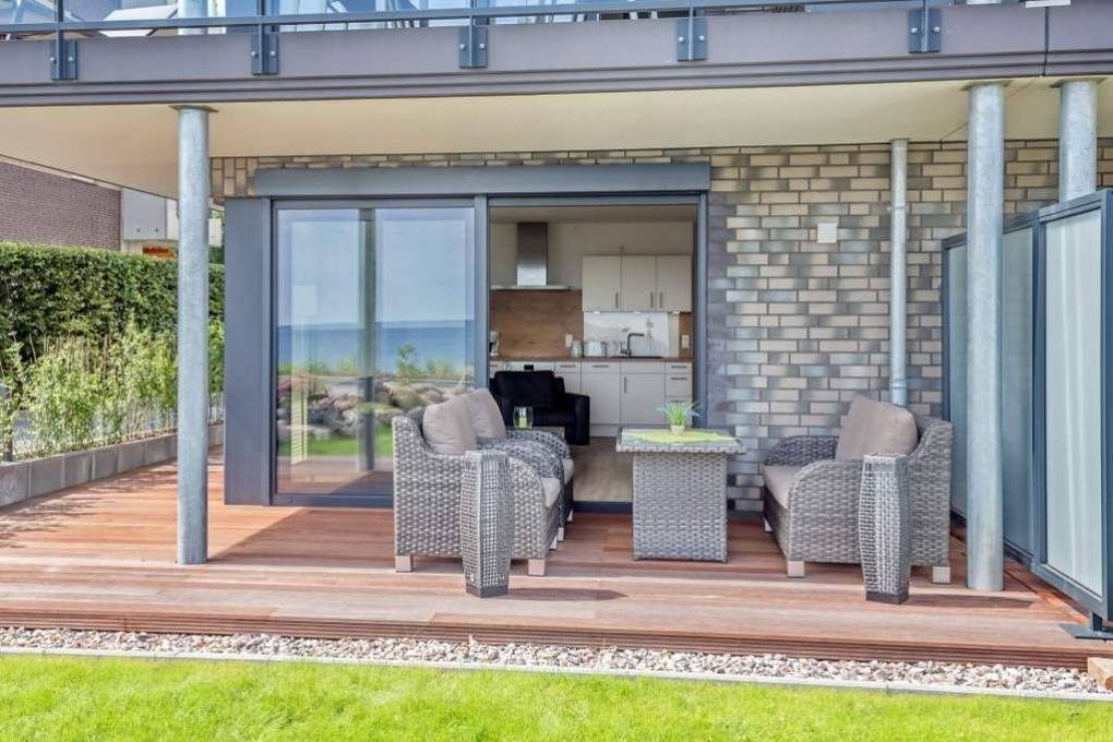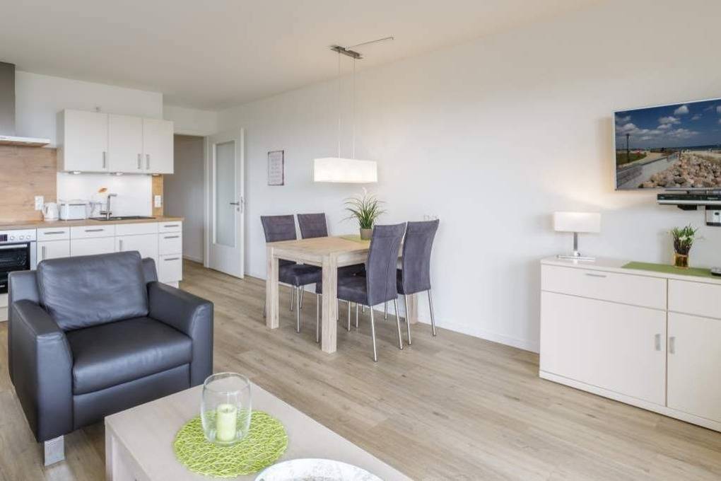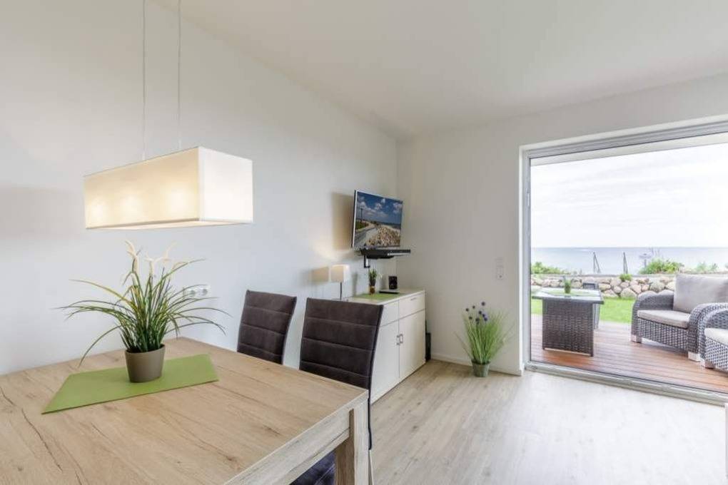 Die geräumige Wohnung ist lichtdurchflutet durch die bodentiefen Fenster im Wohn- und Schlafbereich. Das Wohnzimmer besticht durch den freien Blick auf die Ostsee. Der Wohnbereich ist mit einem gemütlichen Sofa und einem Sessel, Tisch und Sideboard, TV, Stereo-Anlage liebevoll eingerichtet. Integriert sind hier der Essbereich und die voll ausgestattete Küche. Mahlzeiten mit Meerblick sind garantiert. GEnießen Sie die herrliche Terrasse, mit bequemen Gartenmöbeln … hier verweilen … entspannen … Blick auf das Meer …