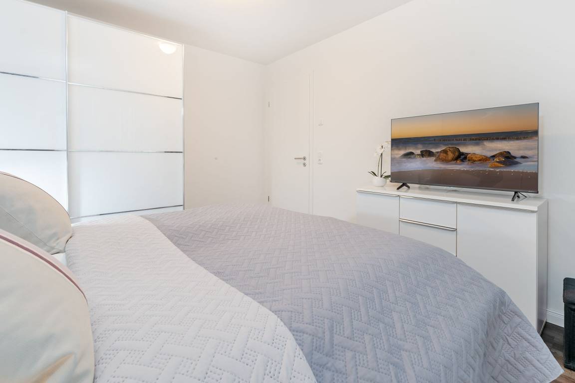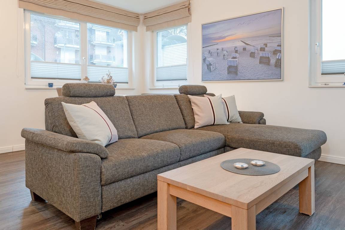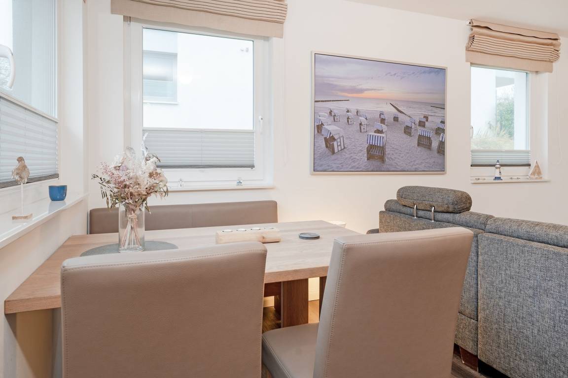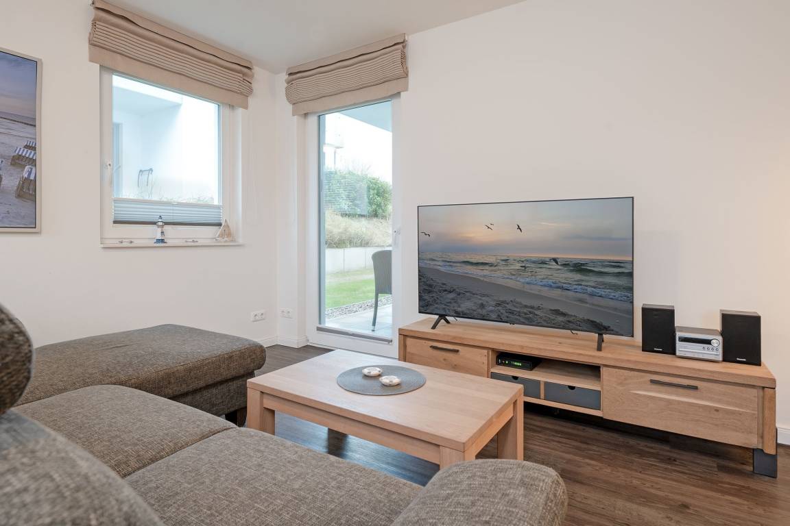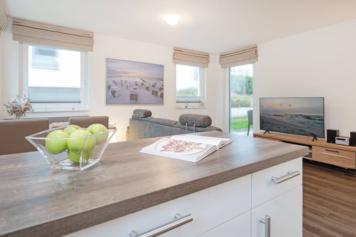 Diese moderne Ferienwohnung im Erdgeschoss bietet die perfekte Unterkunft für einen entspannten Ostseeurlaub. Der Wohnbereich ist gemütlich eingerichtet mit Sofa, TV und Radio. Die südöstlich ausgerichtete Terrasse mit Gartenmöbeln und Sonnenschirm lädt zu entspannten Stunden ein und verspricht Erholung in einem angenehmen Ambiente. Die offene Küche ist mit vielen Extras wie Tassimo-Espressomaschine und Geschirrspüler, ausgestattet. Direkt angrenzend befindet sich der Essbereich mit ausreichend Platz für gemeinsame Mahlzeiten. Das Schlafzimmer ist mit einem komfortablen Doppelboxspringbett (180x200 cm) möbliert - und im Wohnbereich finden auf der Schlafcouch zwei weitere Personen eine Schlafmöglichkeit (ca. 140x220cm). Das Badezimmer bietet eine bodengleiche Dusche, Fußbodenheizung, einen beheizbaren Handtuchhalter sowie einen Haartrockner. Genießen Sie die Strandnähe und das charmante Ambiente von Scharbeutz in dieser komfortablen Ferienwohnung!