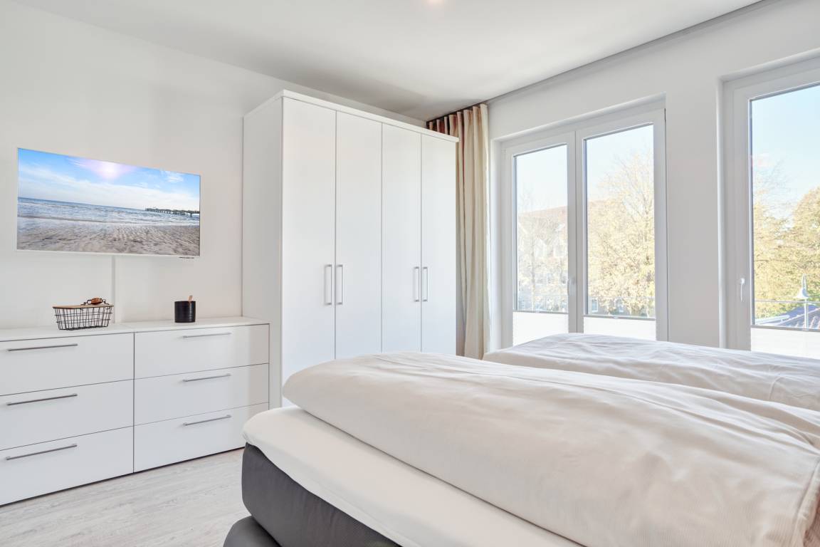 Die Ferienwohnung strahlt mit ihren bodentiefen Fenstern eine helle, behagliche Gemütlichkeit aus. Die Einbauküche im Wohn-Essbereich ist komplett ausgestattet und lässt keine Wünsche offen; Küchenzeile mit Backofen, Ceran-Kochfeld, Elektroherd,[nbsp] Geschirrspüler, Kühlschrank und Gefrierschrank, Filterkaffeemaschine, Krups-Kapsel-Maschine. Der Wohnbereich ist mit einem hochwertigen Sofa (kann mit wenigen leichten Handgriffen zu einem vollwertigen Bett umgebaut werden), einem Wohnzimmertisch, einem großen TV sowie einem Essbereich ausgestattet. Aus dem Wohnbereich gelangen Sie auf den herrlichen Sonnenbalkon nach Südwesten. Hier stehen Ihnen Tisch und Stühle sowie ein Relaxsessel zur Verfügung. Das Schlafzimmer ist mit einem Boxspringbett (180x200) ausgestattet und verfügt über einen Kleiderschrank, 2 Nachttische und einen TV. Sind Sie es gewohnt, im Dunkeln zu schlafen? Kein Problem, denn es stehen Ihnen elektrische Außenrollläden zur Verfügung. Das Duschbad in heller Optik mit bodengleicher Dusche und Handtuchheizkörper, Fön, Kosmetikspiegel. Großer, halb umlaufender Südwestbalkon mit Tisch und Stühlen sowie zwei Relax-Sesseln. Die gesamte Wohnung ist mit einer Fußbodenheizung sowie mit einem Sicht- bzw. Lichtschutz an allen Fenstern und zusätzlichen elektrischen Rollläden ausgestattet.