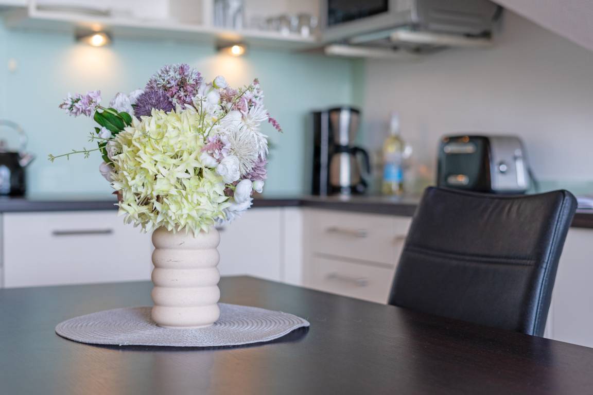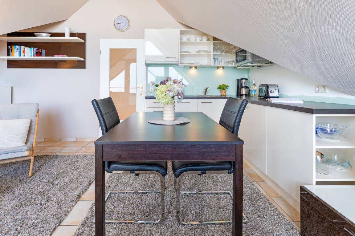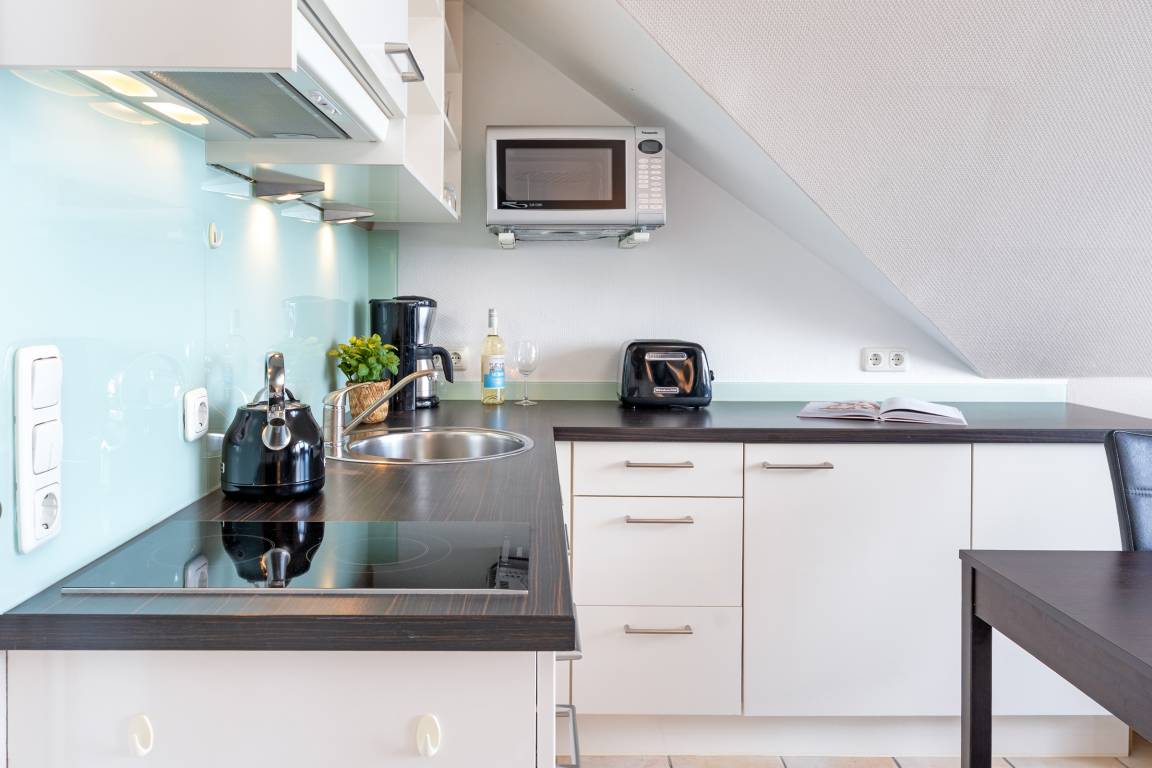 Ihre Ferienwohnung befindet sich im 3. OG der Anlage Strandburg, unmittelbar an der Scharbeutzer Strandpromenade. Über einen kleine Flur gelangen Sie in den offenen Wohn- und Essbereich. Die Küchenzeile ist in den Wohnbereich integriert und hält alle Annehmlichkeiten wie eine Mikro-Back-Kombi, ein 2-Platten-Cerankochfeld und Co. bereit, um nach einem Strandtag die wohlverdiente Mahlzeit zuzubereiten. Die zwei bequemen Relaxsessel sind nicht weit entfernt - von hier aus, oder auch vom lauschigen Ost-Balkon, kann nach dem Essen den Blick über die tiefblaue Ostsee schweifen lassen. Für musikalische Untermalung sorgt ein Bose-Radio. Das Schlafzimmer besticht mit einem bequemen Boxspringbett (180 x 200cm), einem Kleiderschrank und der Möglichkeit, das Zimmer bei Nacht angenehm mithilfe von Plissees abzudunkeln. Der nächste Ostseetag kann im Duschbad mit beheizbarem Handtuchhalter entspannt losgehen.