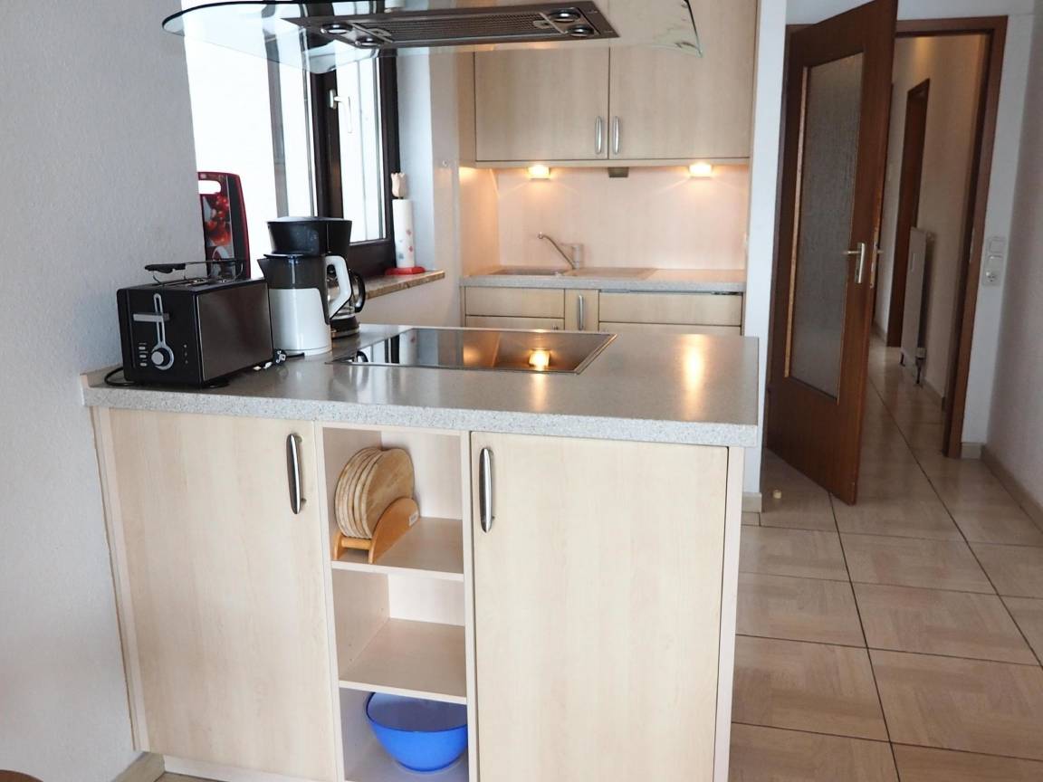 Die offene Einbauküche nebst Kochinsel und Essplatz ist mit ausreichenden Utensilien ausgestattet. Der Essplatz bietet Platz für vier Personen.