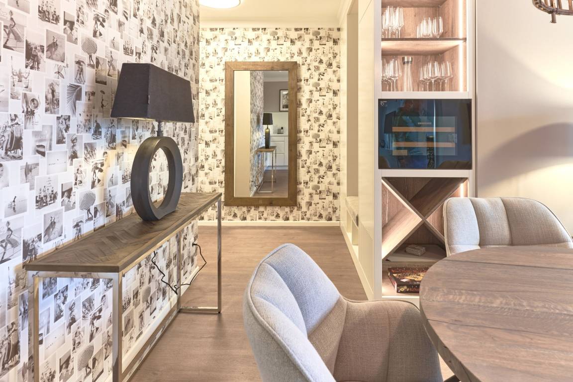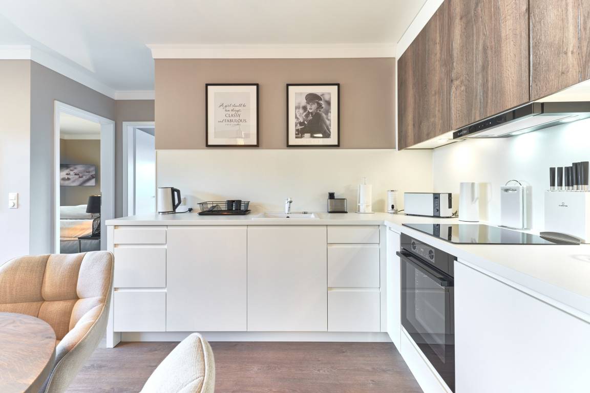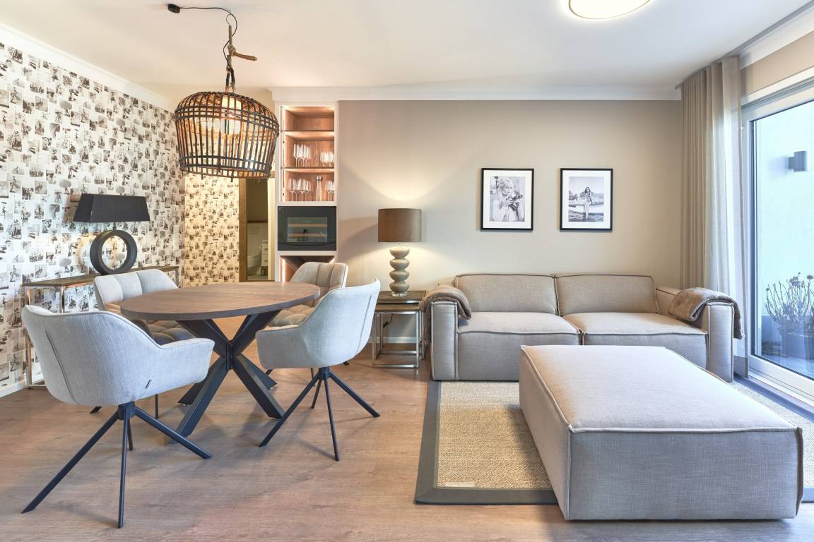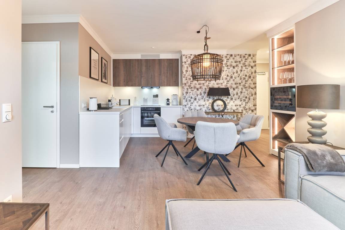 Diese ca. 68m² große Design-Ferienwohnung zeichnet sich durch eine moderne, stylische und exklusive Inneneinrichtung (Markenhersteller und individuelle Tischlereinbauten) aus, die bis ins Detail aufeinander abgestimmt ist. Die Küche in heller Optik ist mit hochwertigen Einbaugeräten ausgestattet. Neben einer Kaffeemaschine steht Ihnen auch eine Nespresso-Maschine zur Verfügung. Außerdem finden Sie Spülmaschine, Induktionsherd, Weinkühlschrank und vieles mehr. Freuen Sie sich auf diese feine Wohlfühlwohnung. Das Wohnzimmer ist mit[nbsp] Entertainment-Smart-TV in 55 Zoll und einem Soundbar-System ausgestattet. Dieses kann per Bluetooth mit einem Smartphone / Tablet angesteuert werden. Im Wohn-Essbereich können Sie die Seele baumeln lassen.