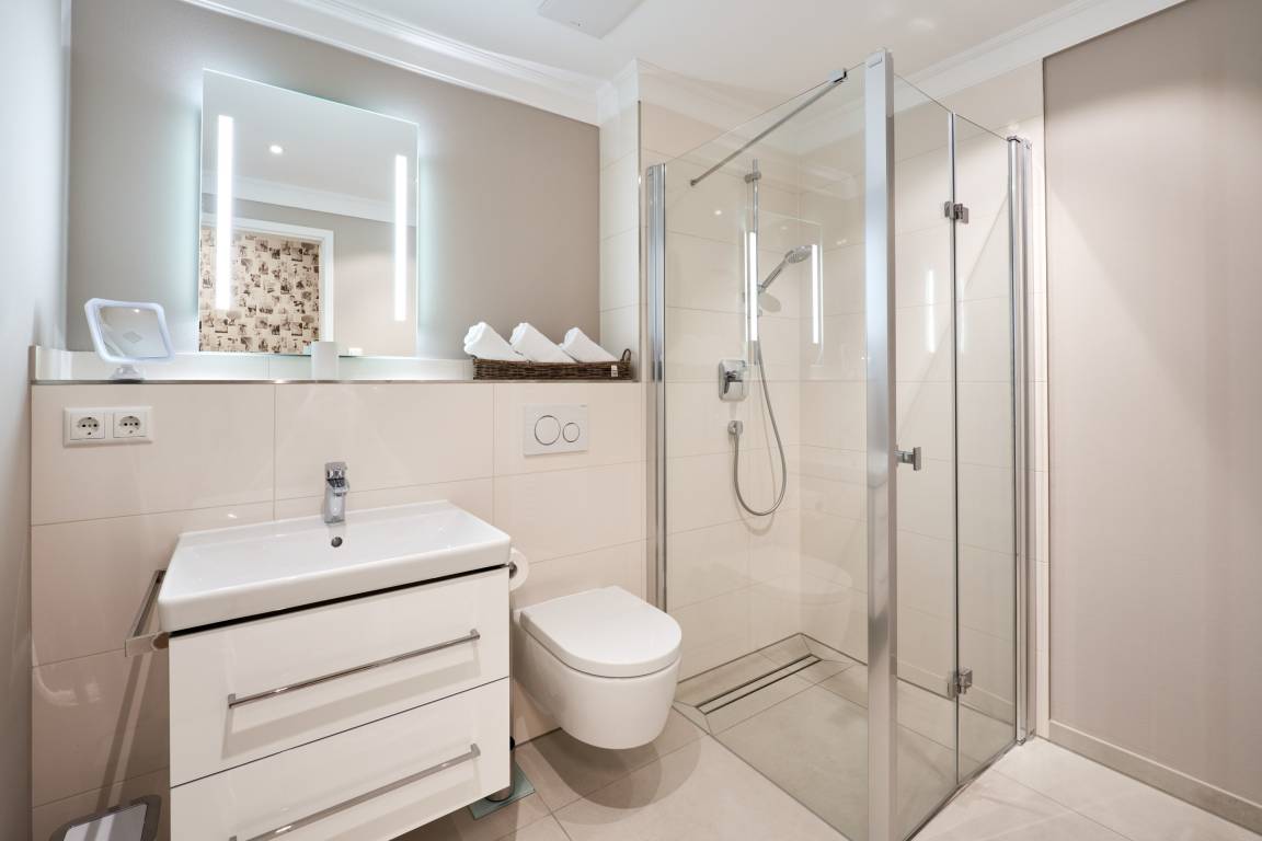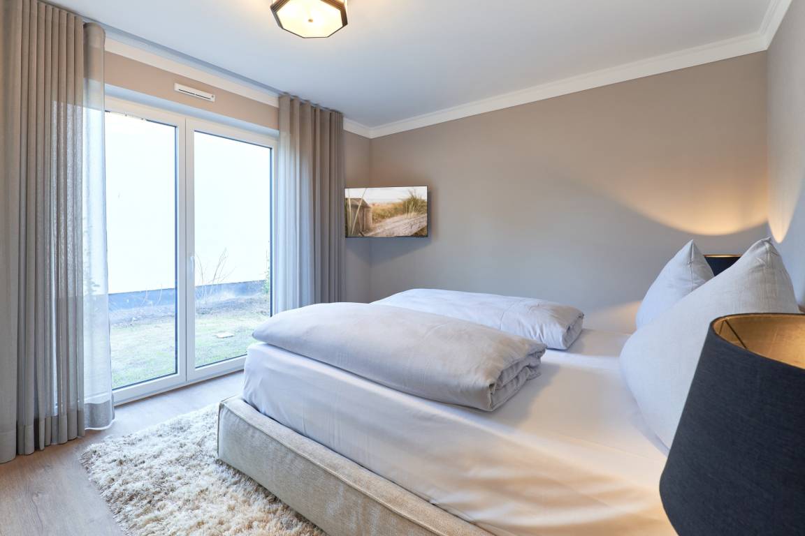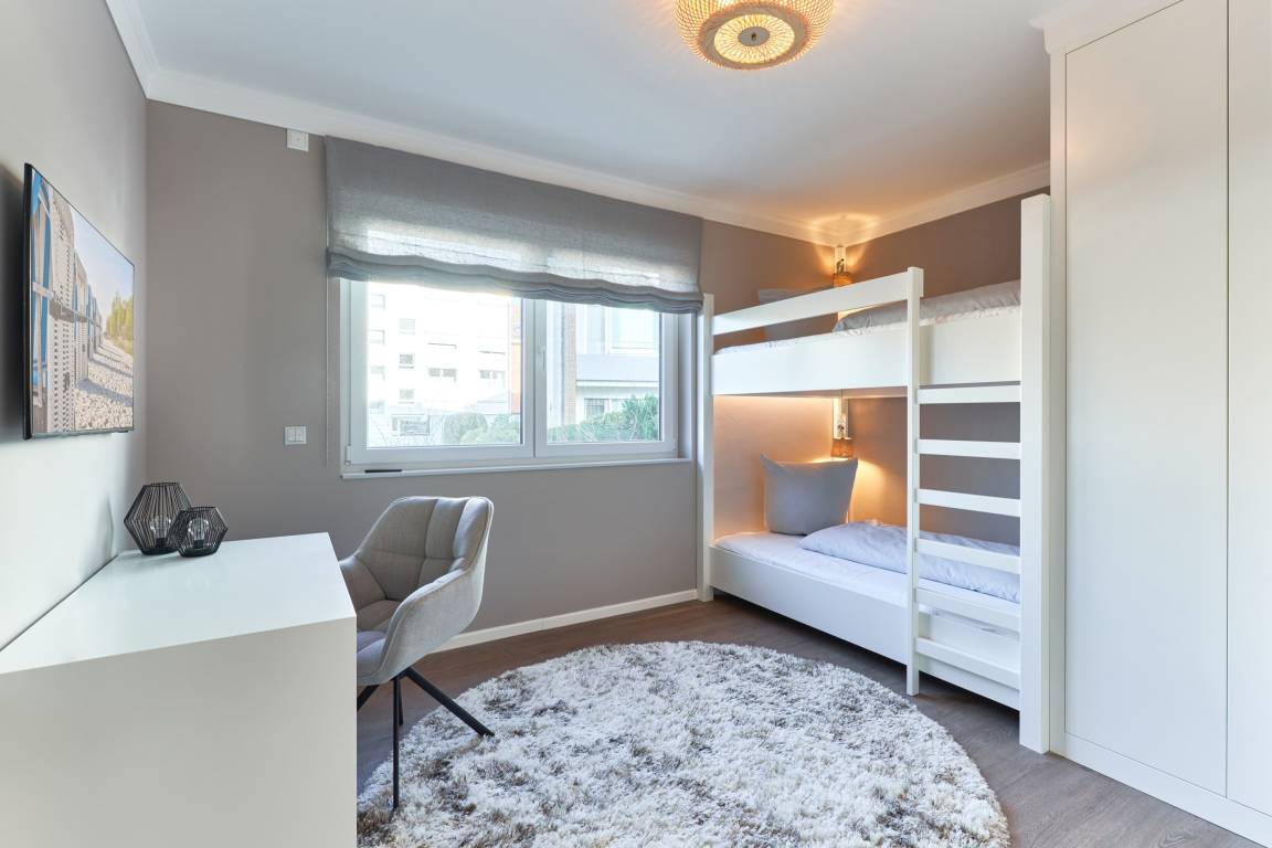 Das erste Schlafzimmer ist mit einem bequemen Doppelbett (1,80m x2,00m), einem Smart-TV (43 Zoll) sowie mit einem Kleiderschrank ausgestattet. Im 2. Schlafzimmer stehen ein hochwertiges Etagenbett (1,20 m x 2,00m), angrenzend ein Einbauschrank sowie ein Schreibtisch, angefertigt in hochwertiger Tischlerarbeit, sowie ein TV (43 Zoll) für Sie bereit. Alle Räume lassen sich durch Außenrollläden verdunkeln. Das Duschbad hält für Sie einen Handtuchheizkörper und einerbodengleichen Dusche bereit. Kosmetikspiegel und Haartrockner sind hier selbstverständlich vorhanden.