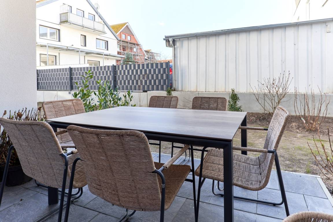 Auf der schönen West-Terrasse können Sie Ihre Mahlzeiten am Gartentisch mit Stühlen einnehmen.