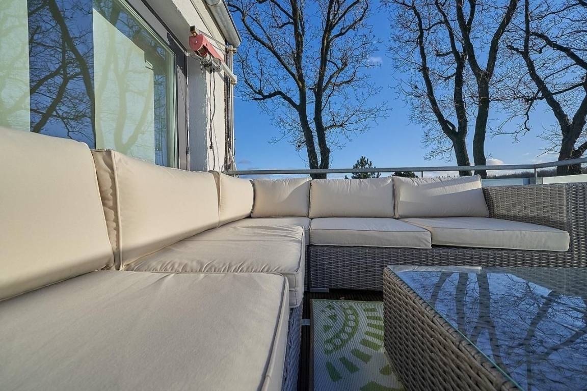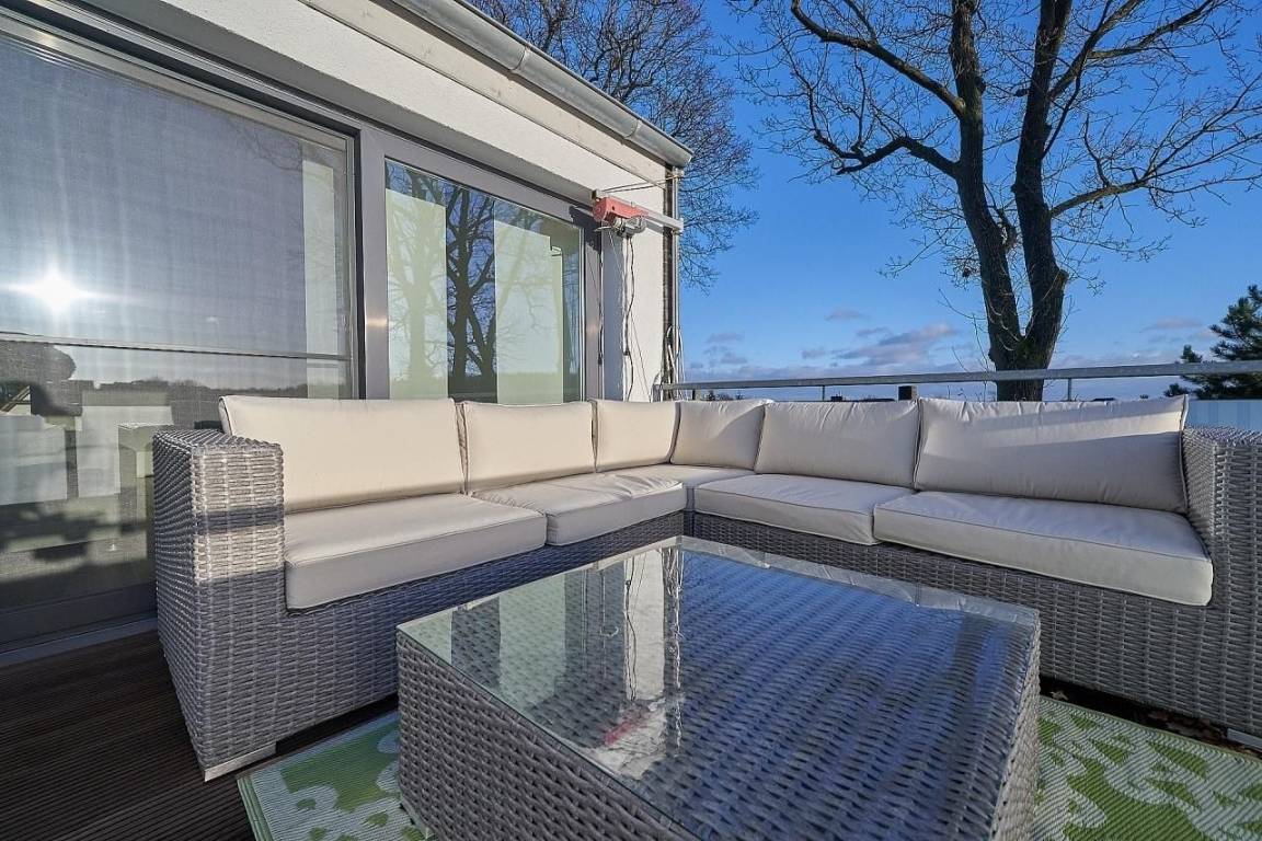 Vom großzügigen Wohnraum treten Sie hinaus auf die fantastische ca. 50 m² große, mit Schiffsboden versehene Dachterrasse. Genau der richtige Platz, um die nordische Abendstimmung mit Blick ins Grüne und entfernt auf die Ostsee zu genießen.