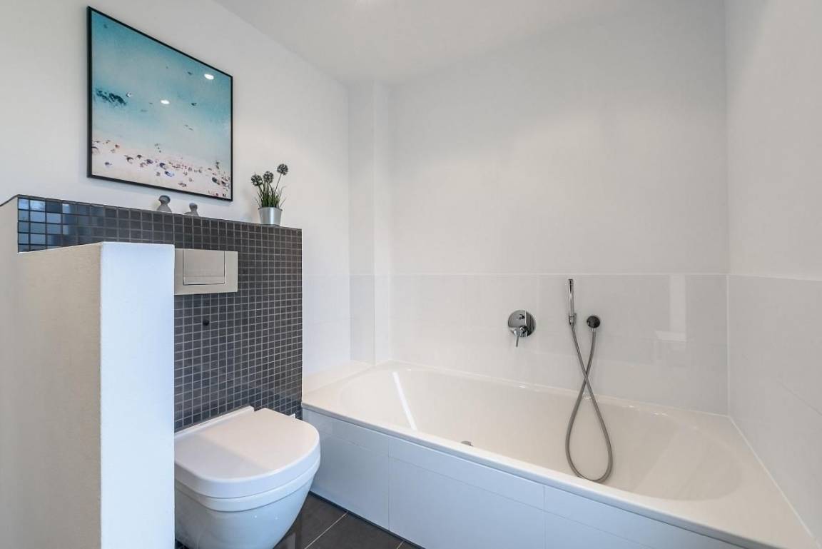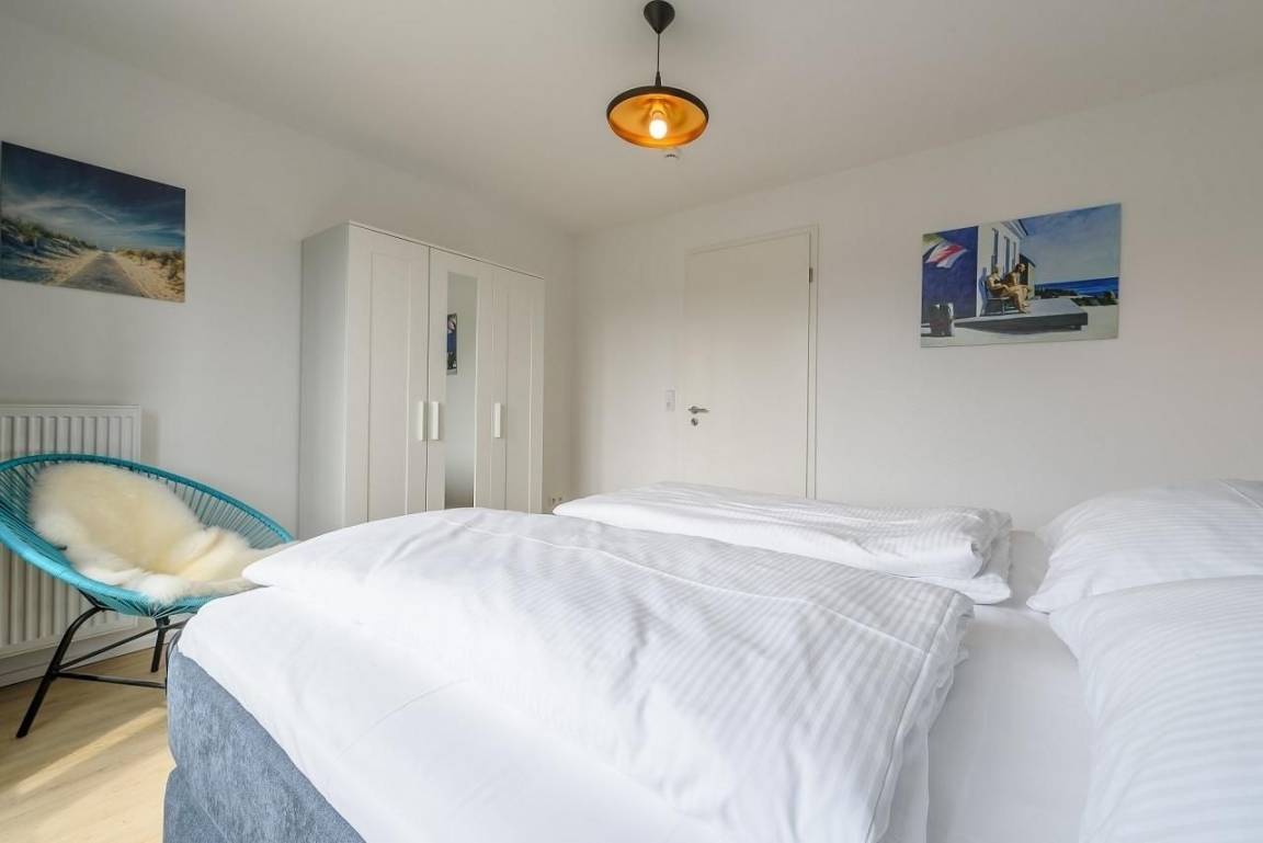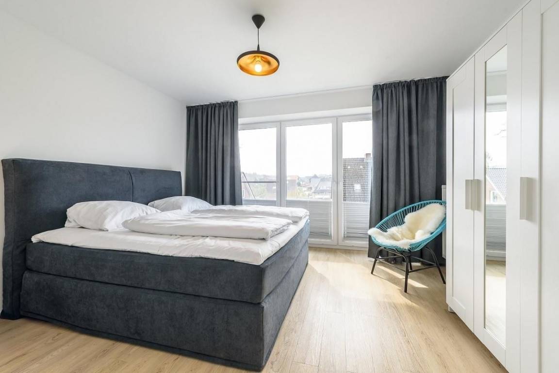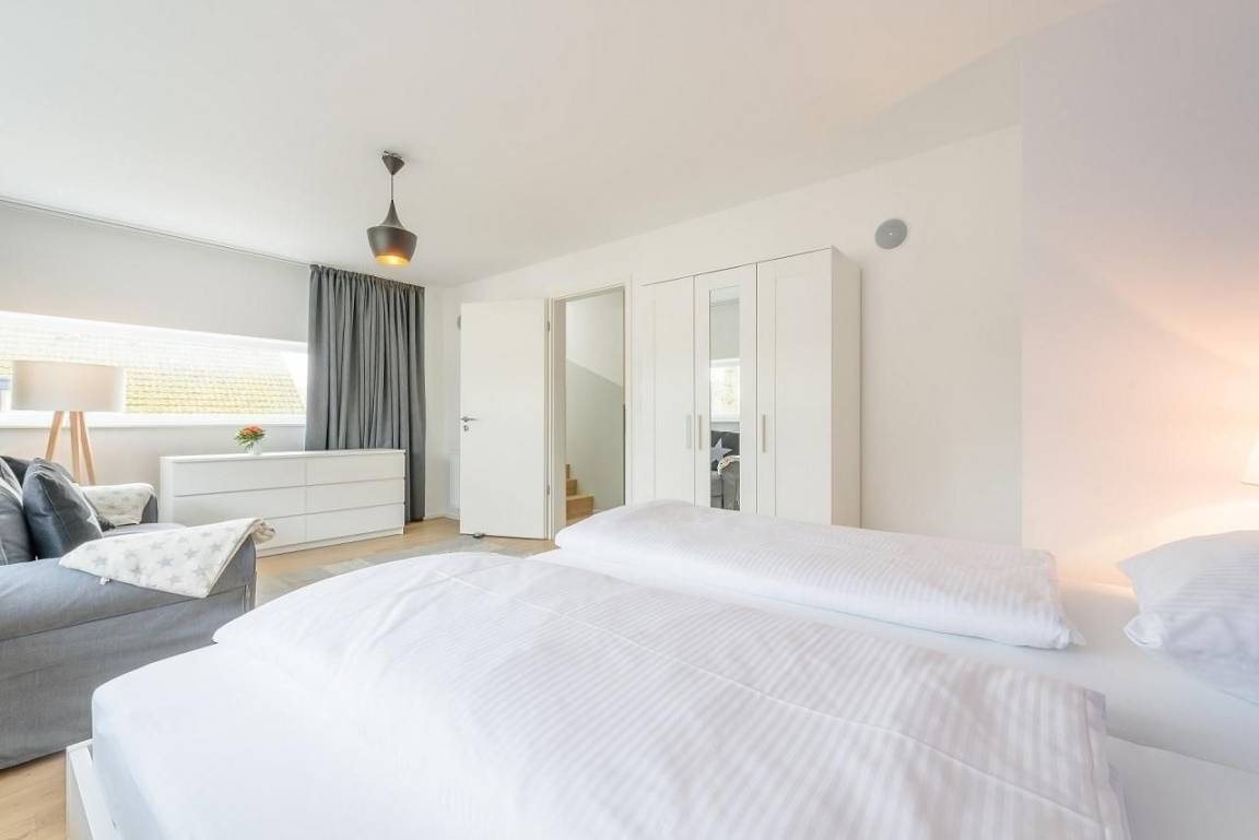 Verbunden durch breite Flure sind auf dieser Ebene insgesamt 3 separate Schlafzimmer, 2 Bäder und ein Ankleidezimmer. Am Ende des Flures auf der rechten Seite befindet sich ein Schlafzimmer mit Boxspringbett (180x200 cm), Kommode und Flatscreen TV. Daneben ein modernes Vollbad mit Badewanne und Dusche. Ein Ankleidezimmer mit zwei durchgängig offenen Schränken trennt die beiden "Elternschlafzimmer" auf dieser Seite. Im 2. Schlafzimmer sind ebenfalls ein Boxspringbett (180x200cm) und ein zusätzlicher Kleiderschrank. Diese beiden Schlafzimmer haben bodentiefe Fenster mit Plissees und Verdunkelungsgardinen. Ein Tageslicht helles Duschbad mit Rainshower-Dusche ist gleich daneben. Links von der Eingangstür ist das 3. großzügige Schlafzimmer mit Doppelbett (2x 90x200 cm), Schlafsofa (160x200 cm), Kleiderschrank und Kommode. Ausreichend Platz für die "Kleinen" zum Spielen ist hier vorhanden.