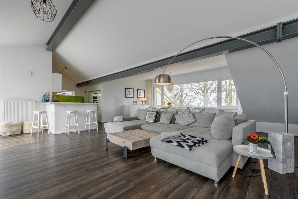 Eine Treppe mit Designbodenbelag führt Sie in den oberen Bereich. Wow... werden Ihre ersten Worte sein! Auf der gesamten Ebene ist der offene Wohn- Essbereich mit einer 42qm großen Dachterrasse. Charmante Dachschrägen mit freiliegenden Stahlträgern, lichtdurchflutetet durch die breite bodentiefe Fensterfront besticht dieser Raum. Eine große Sofalandschaft ausgerichtet zum Balkon lädt zum Entspannen nach einem erlebnisreichen Urlaubstag ein. Gegenüber, die moderne vollausgestattete Küche, die keine Wünsche offen lassen dürfte. Am Tresen können Sie einen kleinen Aperitif genießen. "Tafeln Sie auf" .... ein großer Esstisch lädt dazu ein.