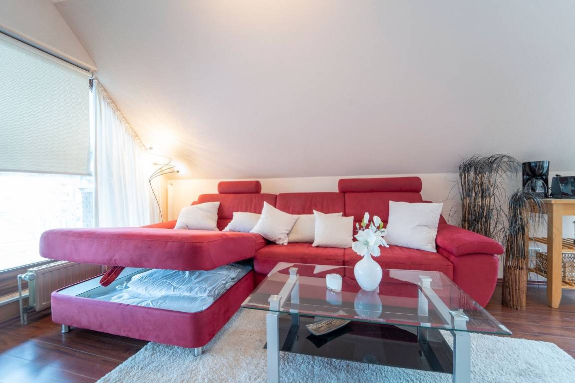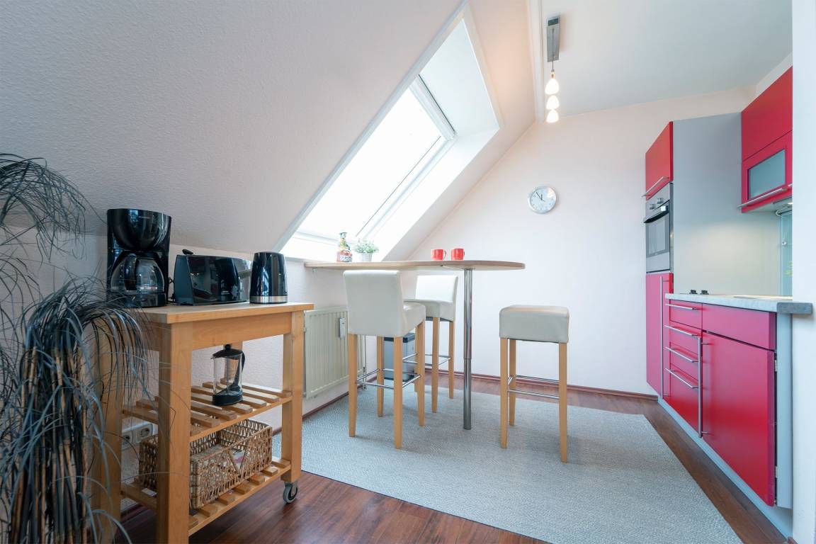 Jetzt kann der Urlaub beginnen! Geradezu das Wohnzimmer mit offener Wohnküche. Spaß macht das gemeinsame Kochen in der komplett ausgestatteten Küche. Gleich daneben die Essecke- den Tisch können Sie nebenbei decken und im Anschluss wunderbar essen. Die Couch lässt sich zu einer Schlafgelegenheit (140x200 cm) verwandeln. Von Wohnzimmer aus gelangen Sie auf den Balkon, der Sie morgens zum ersten Kaffee einlädt. Das Duschbad mit Handtuchwärmer, Föhn und WC liegt gleich neben dem Flur. Eine Wendeltreppe führt aus dem Wohnbereich hinauf in die zweite Ebene. Dort wartet auf Sie eine gemütliche Leseecke, die Sie mit tollen Büchern zum Verweilen einlädt. Das Schlafzimmer mit Dachschrägen ist mit einem Doppelbett (160x200cm), Nachttischen auf jeder Bettseite, Nachttischlampen und einem Schminktisch ausgestattet. Das Dachfenster hat ein Verdunkelungsrollo. Öffnern Sie das Fenster – sehen Sie die Ostsee? Zum Teil können Sie entfernt auf die Ostsee sehen.
