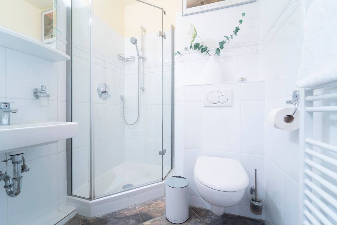 Nur noch wenige Stufen trennen Sie von der Eingangstür Ihres Feriendomizils (ca. 55 qm). Tür auf - und Sie sind da! Lichtstrahlen von den großen Fenstern fallen in den Eingangsflur, Jacken und Schuhe sind ordentlich aus der Sicht geräumt in dem Einbauschrank.
