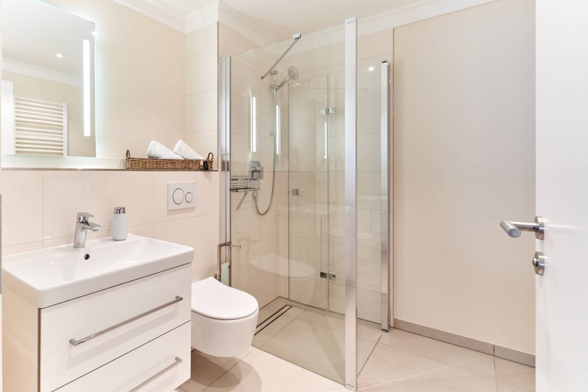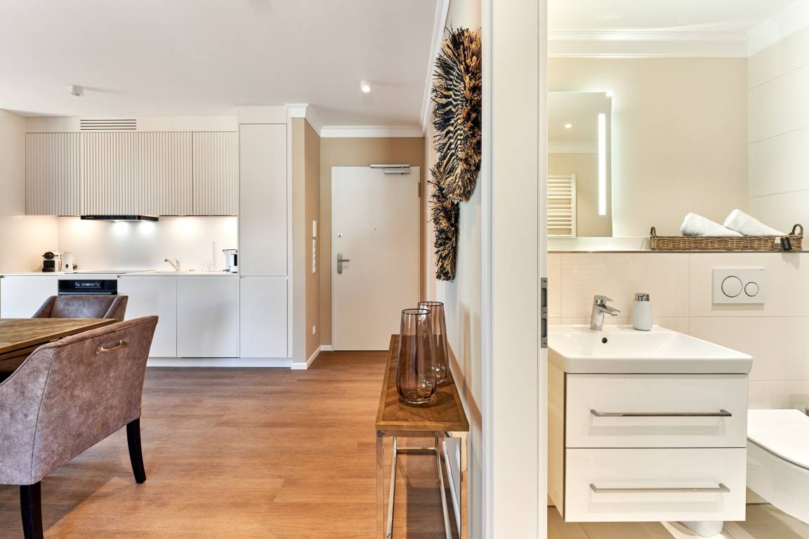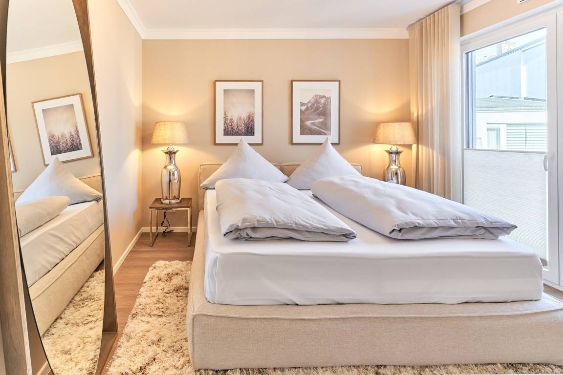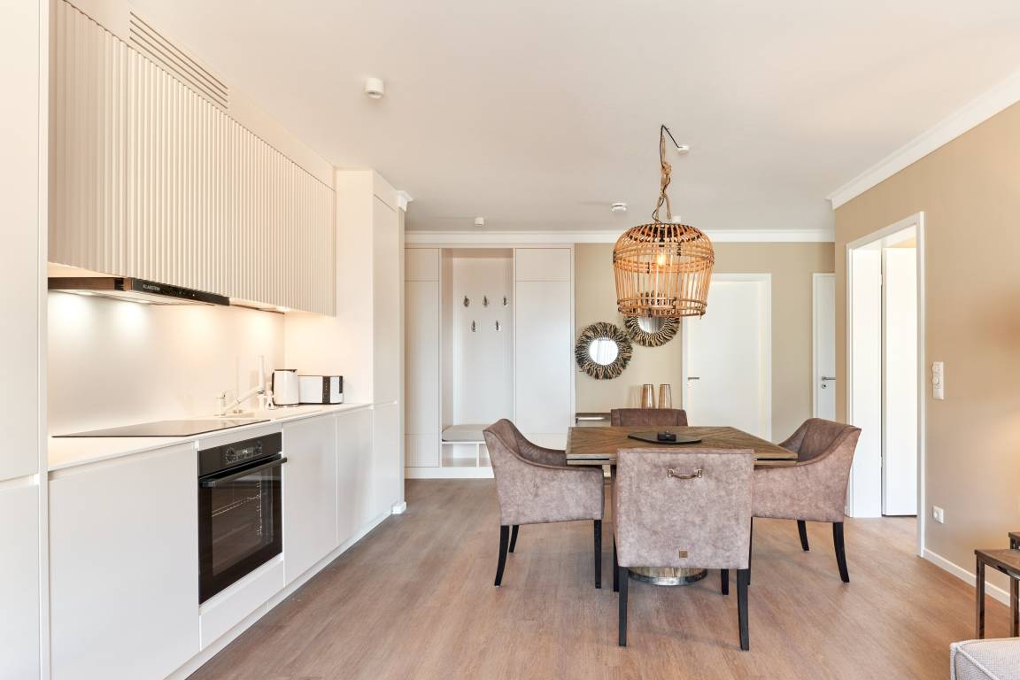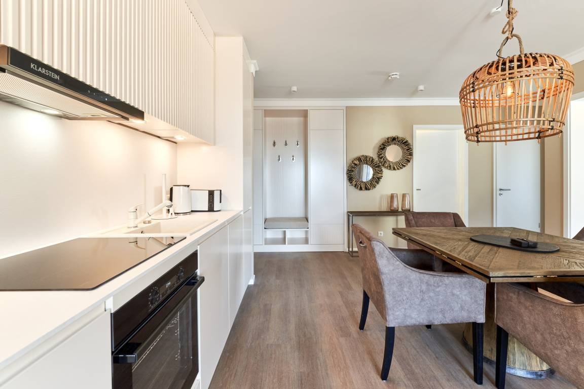 Diese ca. 68m² große Design-Ferienwohnung zeichnet sich durch eine moderne, stylische und exklusive Inneneinrichtung (Markenhersteller und individuelle Tischlereinbauten) aus, die bis ins Detail aufeinander abgestimmt ist. Die Küche ist in heller Optik und mit hochwertigen Einbaugeräten ausgestattet. Neben einer Kaffeemaschine steht Ihnen auch eine Nespresso-Maschine zur Verfügung.[nbsp] Freuen Sie sich auf diese feine Wohlfühlwohnung. Im Wohnzimmer stehen Ihnen ein[nbsp] Entertainment-Smart-TV in 55" und eine Soundbar zur Verfügung. Das Soundbar-System kann ebenfalls per Bluetooth mit einem Smartphone / Tablet angesteuert werden. Somit können Sie auch Ihre eigene Musik abspielen oder Ihren Lieblingsradiosender hören. Weiterhin wartet auf Sie ein anspruchsvoller Wohn-Essbereich. Das erste Schlafzimmer ist mit einem sehr bequemen Doppelbett (1,80 x 2,00m), einem Smart-TV (43"), einer hochwertigen Sideboard-Kommode sowie einer Lamellenwand für Kleider und Hemden ausgestattet. Im 2. Schlafzimmer stehen ein hochwertiges Etagenbett (0,90 x 2,00m), angrenzend ein Einbauschrank sowie ein Schreibtisch, angefertigt in hochwertiger Tischlerarbeit, sowie ein TV (43") für Sie bereit. In allen Räumen befinden sich Außenrollläden. Das Duschbad ist mit einem Handtuchheizkörper und einer bodengleichen Dusche ausgestattet. Kosmetikspiegel sowie ein Haartrockner sind selbstverständlich vorhanden.