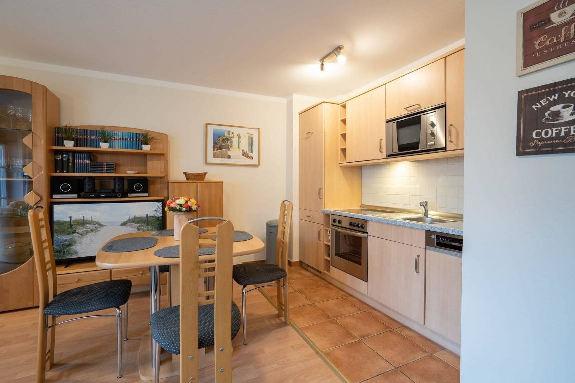 Dieses komfortable 2-Zimmer-Apartment für bis zu 4 Personen, nur 100 m vom Strand entfernt, bietet modernen Komfort, lichtdurchflutete Räume und eine einladende Atmosphäre für den perfekten Urlaub.