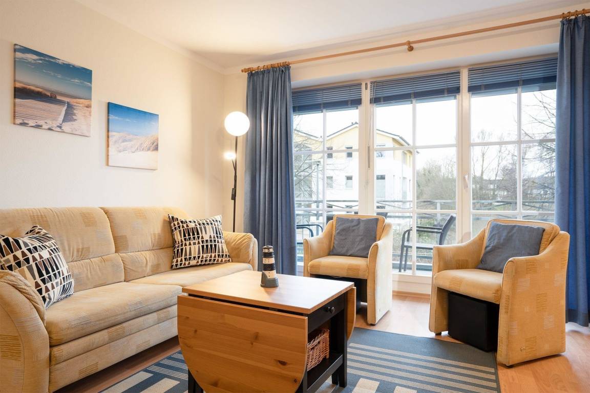 Das 2-Zimmer-Komfort-Apartment in der HANSEATEN RESIDENZ bietet auf ca. 50 m² eine helle und freundliche Atmosphäre. Der lichtdurchflutete Wohnraum ist mit Laminatboden ausgestattet und lädt mit einem Polstersofa, das als Schlafsofa umwandelbar ist, sowie zwei Sesseln und einem Couchtisch zum Verweilen ein. Ein großer Flachbild-TV und ein Radio mit CD- und DVD-Player ergänzen die Ausstattung. Die moderne, integrierte Einbauküche ist mit einem Geschirrspüler, einer Mikrowelle sowie einem Kaffeeautomaten ausgestattet und bietet Platz für einen Esstisch mit vier Stühlen. Im Schlafzimmer befindet sich ein Doppelbett und ein zusätzlicher TV mit DVD-Player. Das Badezimmer überzeugt mit einer Eckdusche und einem Handtuchwärmer. Highspeed-Internet ist ebenfalls vorhanden. Waschmaschine und Trockner stehen gegen Gebühr bereit. Rauchen ist in der Wohnung nicht gestattet.