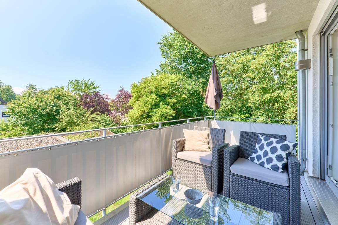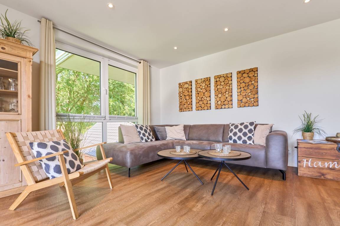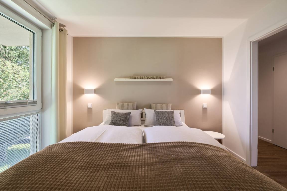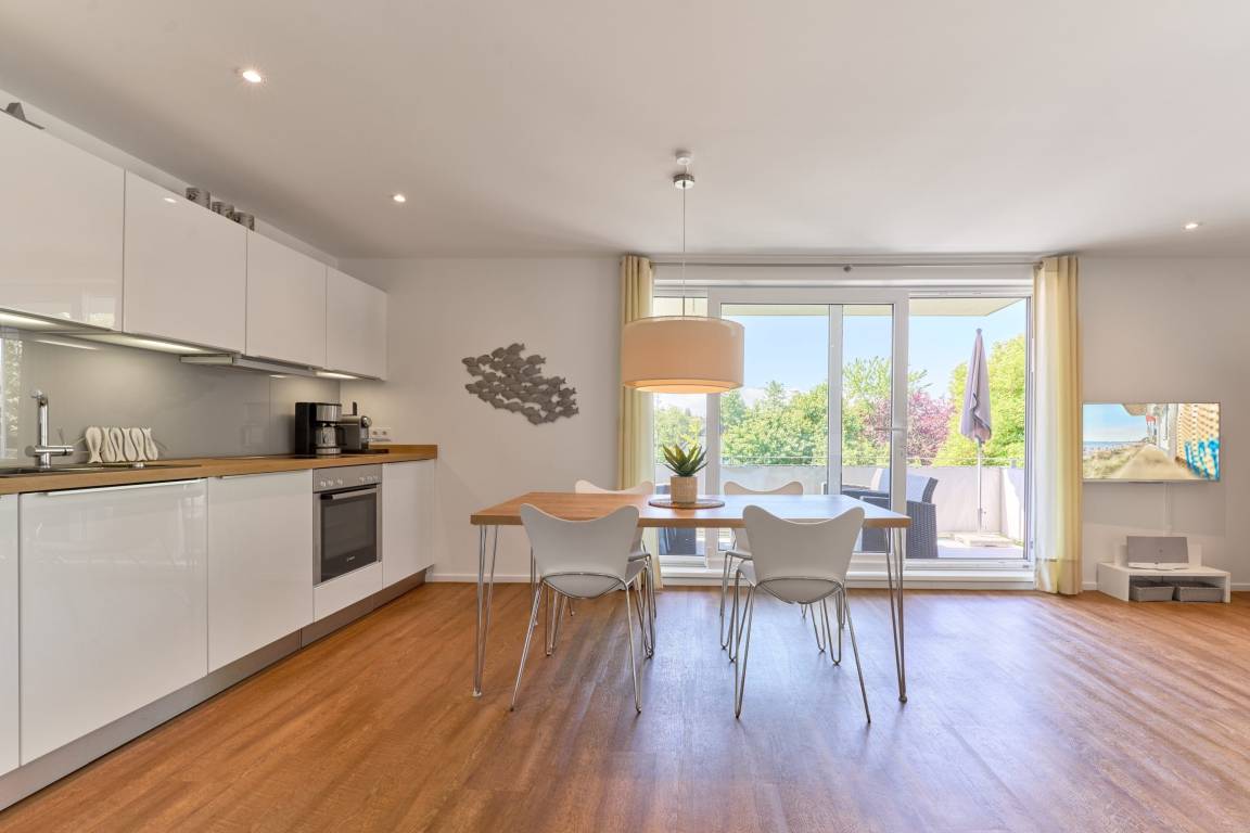 Genießen Sie Ihren Urlaub in dieser lichtdurchfluteten Ferienwohnung, die Ihnen mit ihren zwei geräumigen Schlafzimmern und dem großen Wohnzimmer, mit integrierter Küche, großem Esstisch und gemütlicher Fernsehecke, inklusive Musikanlage, viel Raum zum Entspannen bietet. WLAN steht Ihnen kostenlos zur Verfügung. Der nach Südwesten ausgerichtete Balkon ist mit Lounge-Möbeln ausgestattet. Im ersten Schlafzimmer steht ein bequemes Doppelbett (1,60 x 2,00m), im 2. Schlafzimmer warten 2 Einzelbetten auf Sie. Hier befindet sich auch ein Flachbildfernseher. In beiden Schlafzimmern sind zur Verdunkelung elektrische Rollläden angebracht. Die hellen Badezimmer mit Tageslicht verfügen über bodentiefe Duschen und neben der Fußbodenheizung steht Ihnen hier ein Handtuchheizkörper zur Verfügung.