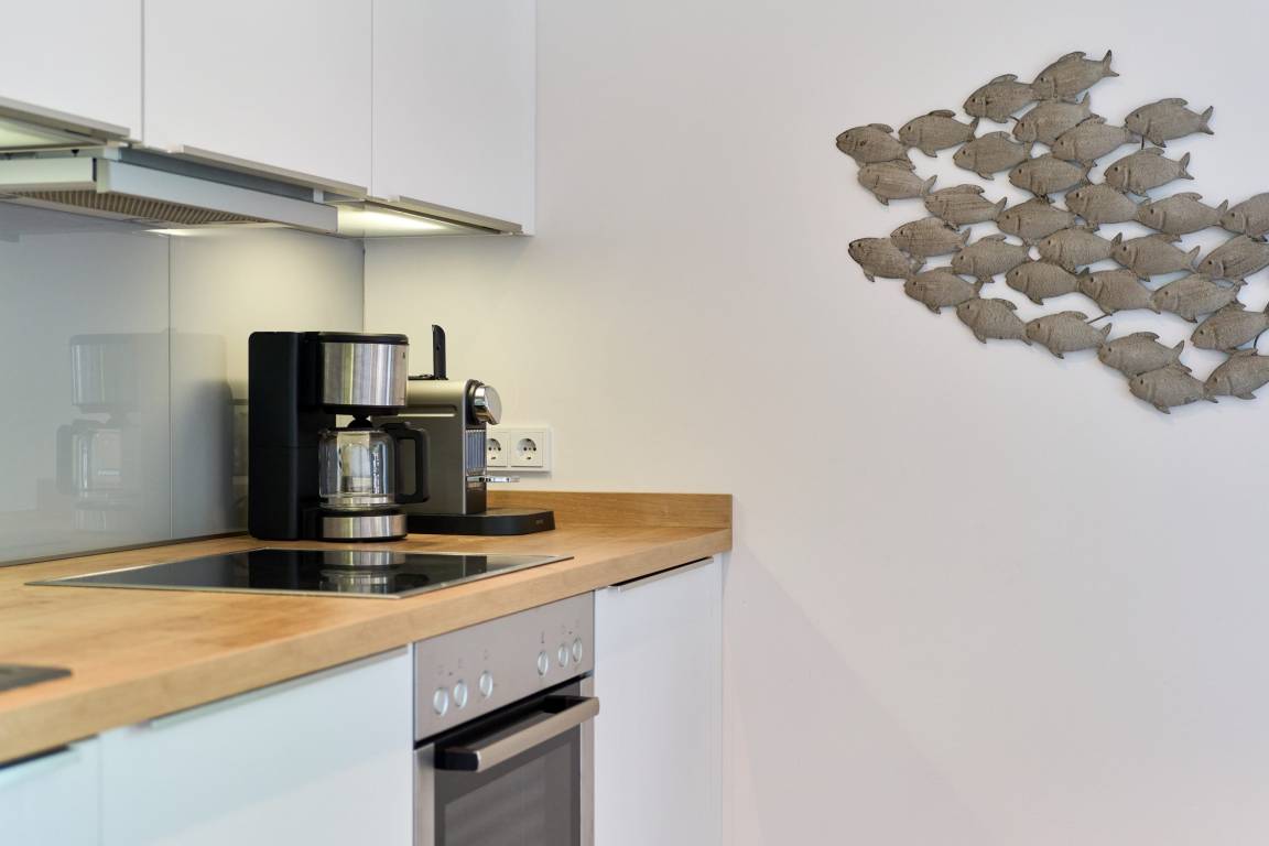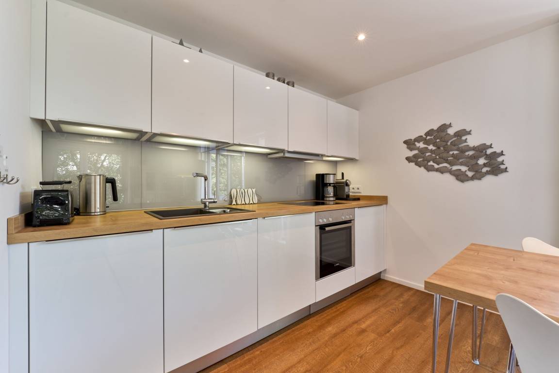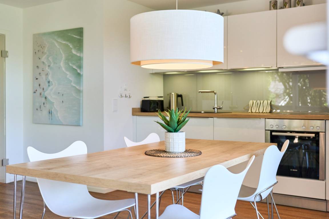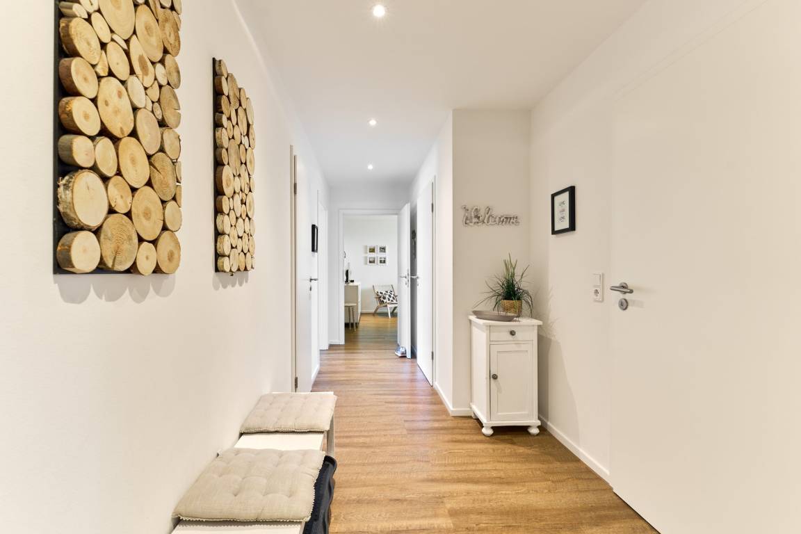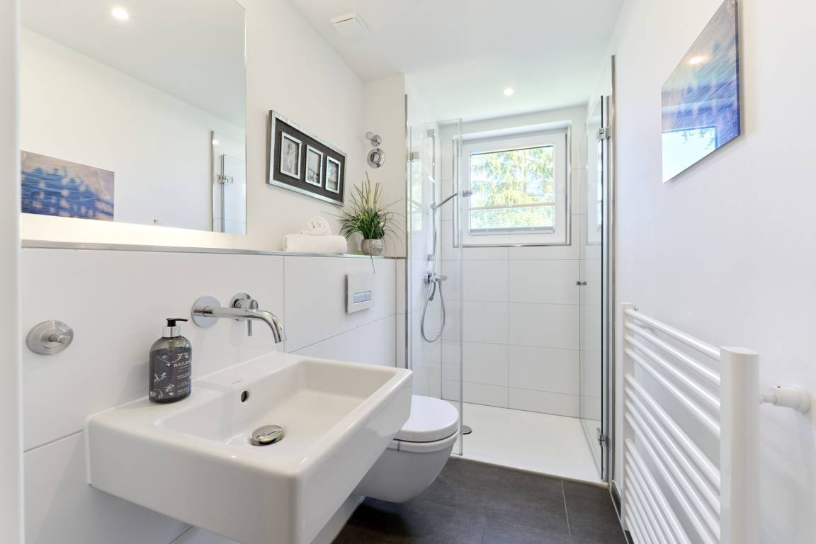 Genießen Sie Ihren Urlaub in dieser lichtdurchfluteten Ferienwohnung, die Ihnen mit ihren zwei geräumigen Schlafzimmern und dem großen Wohnzimmer, mit integrierter Küche, großem Esstisch und gemütlicher Fernsehecke, inklusive Musikanlage, viel Raum zum Entspannen bietet. WLAN steht Ihnen kostenlos zur Verfügung. Der nach Südwesten ausgerichtete Balkon ist mit Lounge-Möbeln ausgestattet. Im ersten Schlafzimmer steht ein bequemes Doppelbett (1,60 x 2,00m), im 2. Schlafzimmer warten 2 Einzelbetten auf Sie. Hier befindet sich auch ein Flachbildfernseher. In beiden Schlafzimmern sind zur Verdunkelung elektrische Rollläden angebracht. Die hellen Badezimmer mit Tageslicht verfügen über bodentiefe Duschen und neben der Fußbodenheizung steht Ihnen hier ein Handtuchheizkörper zur Verfügung.