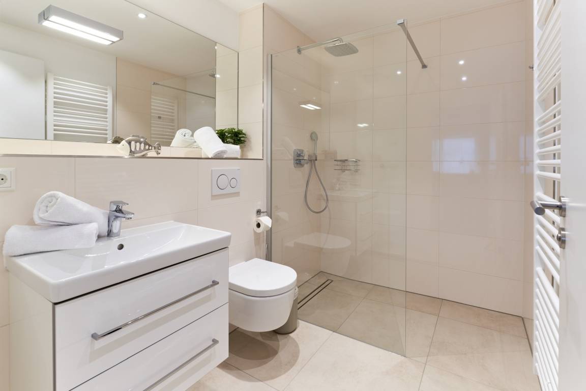 Das erste Schlafzimmer ist mit einem Boxspringbett (1,80m x2,00m), einem Smart-TV (43 Zoll) sowie einem Kleiderschrank ausgestattet. Im 2. Schlafzimmer befinden sich zwei Einzel-Boxspringbetten (100 × 200 cm) sowie ein 43-Zoll-TV. Alle Räume lassen sich durch Außenrollläden verdunkeln. Das Duschbad ist mit einem Handtuchheizkörper und einer bodengleichen Dusche ausgestattet. Kosmetikspiegel und Haartrockner sind hier selbstverständlich vorhanden.