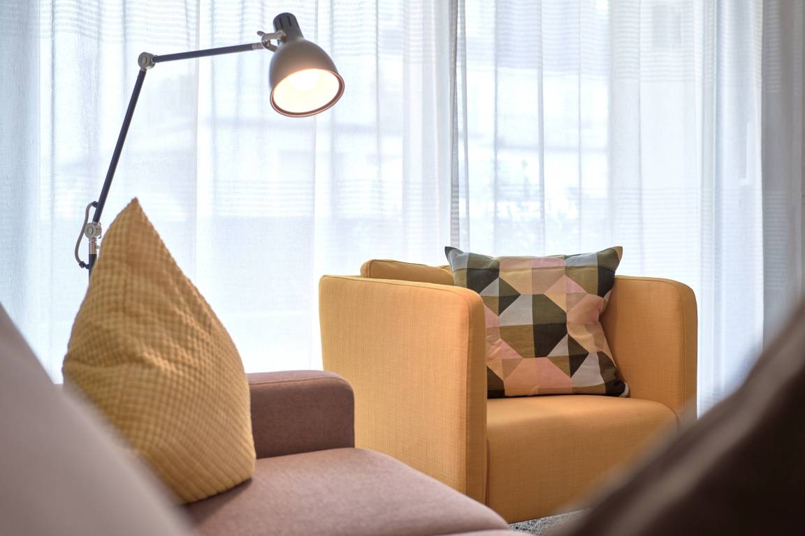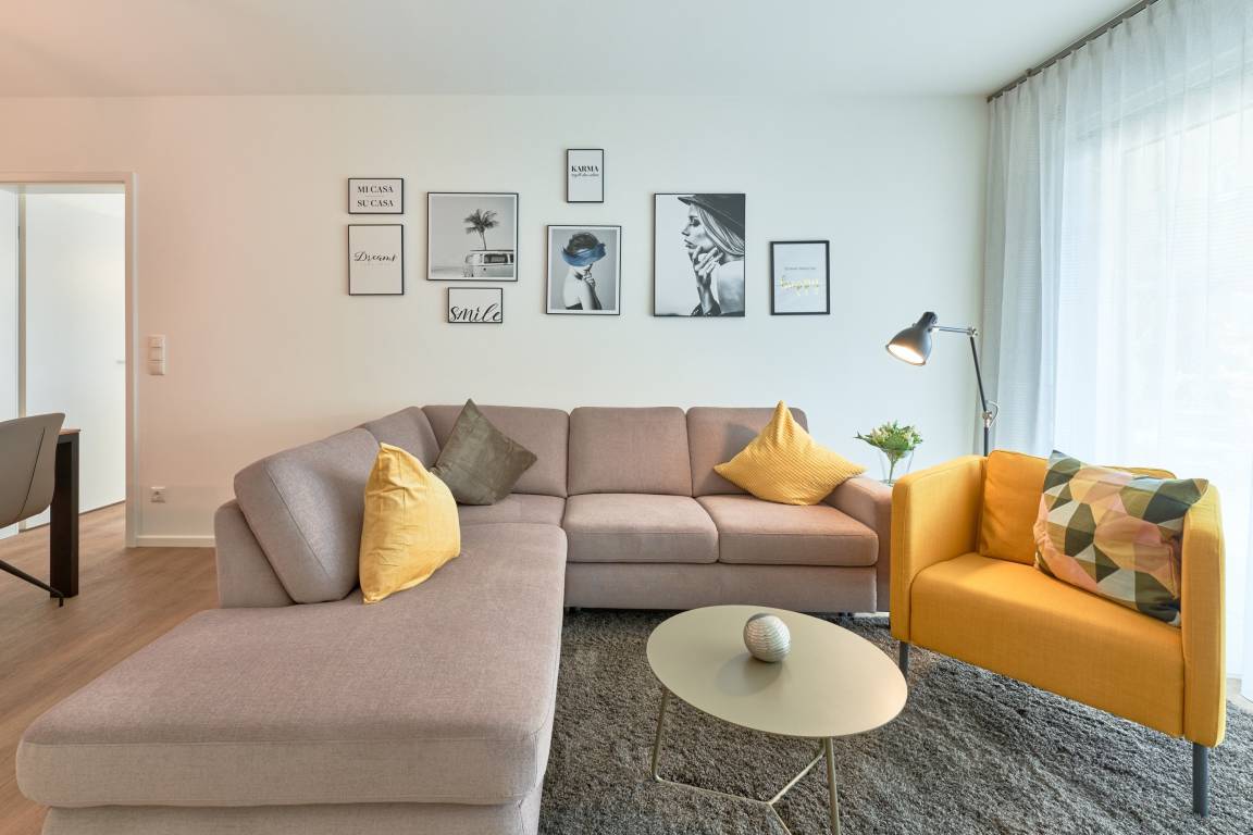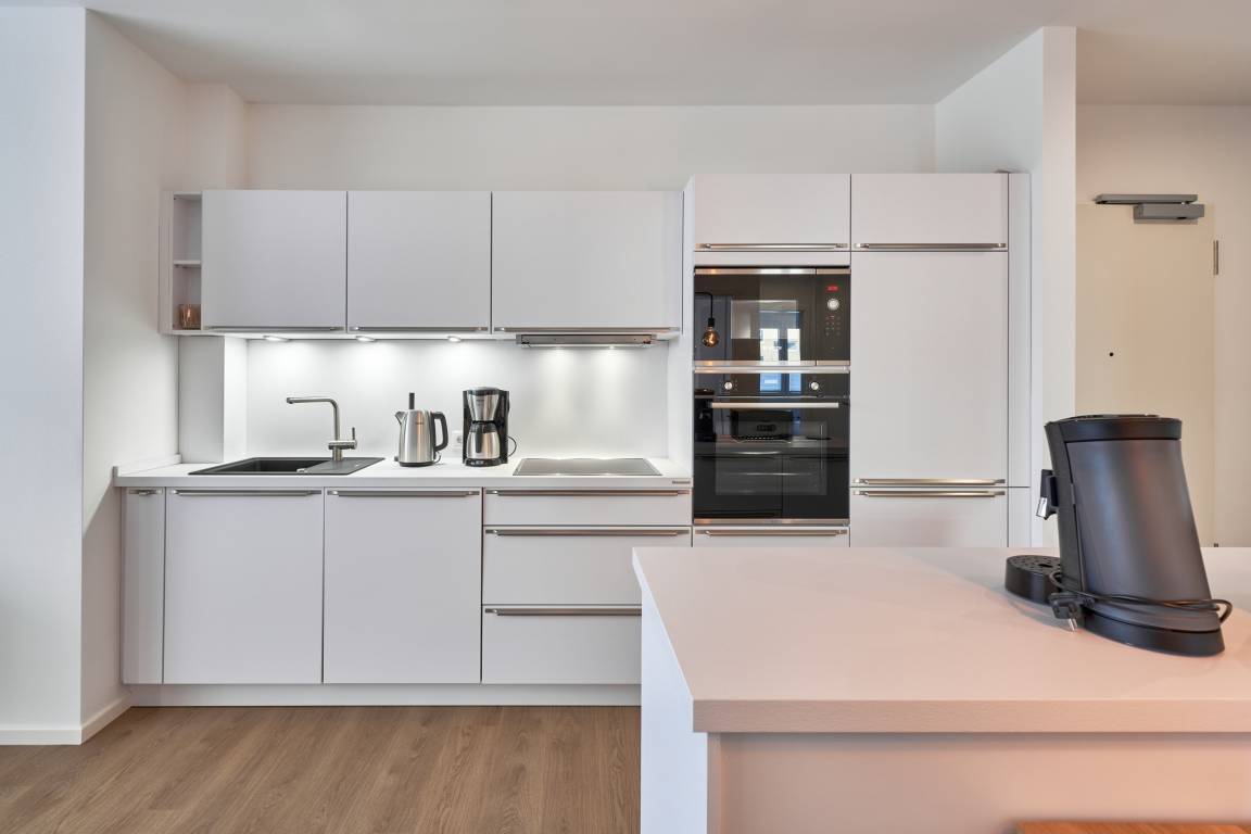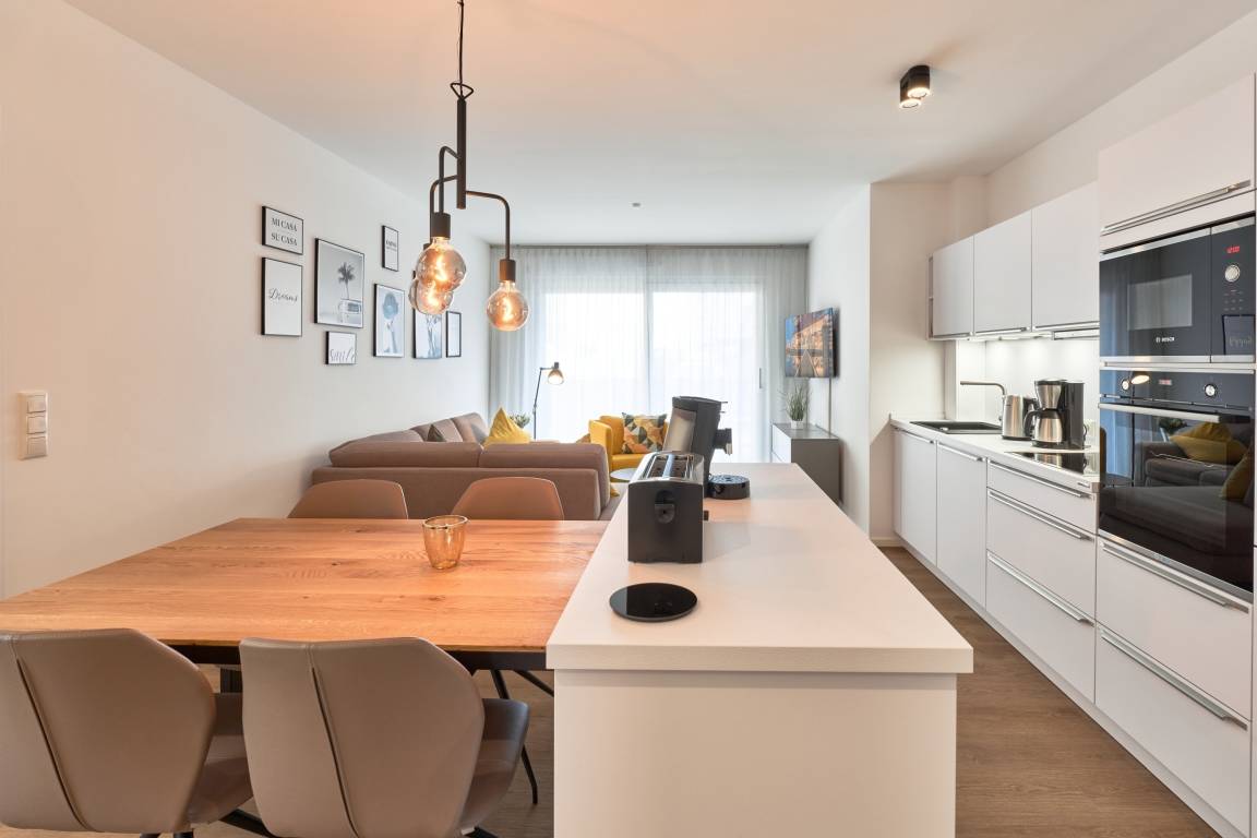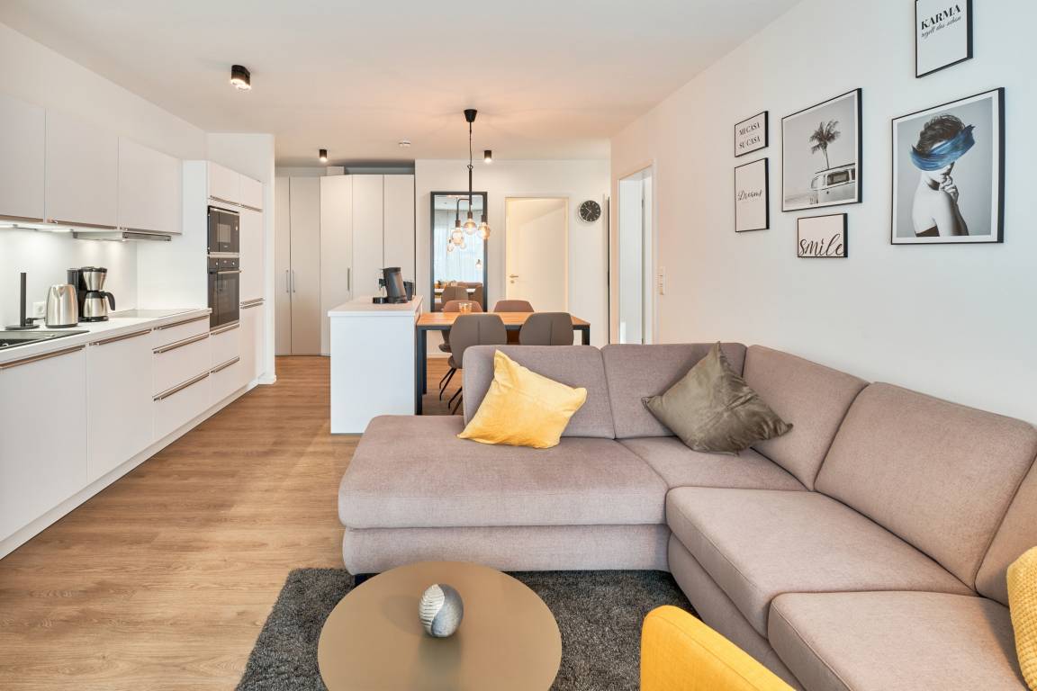 3-Zimmer, 65 qm, im Erdgeschoss, mit Terrasse. Diese feine Wohnung zeichnet sich durch eine moderne sowie gemütliche Inneneinrichtung aus. Die Küche ist mit hochwertigen Einbaugeräten und allen notwendigen Küchenutensilien ausgestattet. Neben einer Kaffeemaschine steht Ihnen auch eine Senseo-Maschine zur Verfügung. Spülmaschine, Induktionsherd, Backofen, Mikrowelle und ergänzen dieAusstattung. Im Wohnzimmer erwarten Sie ein gemütliches Ecksofa, ein Smart-TV in 46 Zoll und Apple AIR Play. Für Ihr Entertainment und digitales Erleben nutzen Sie unbegrenztes Highspeed-WLAN. Der Essbereich bietet Ihnen Platz für 4 Personen.