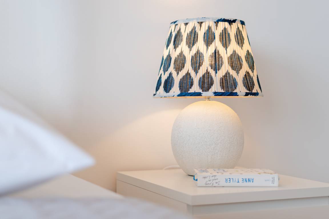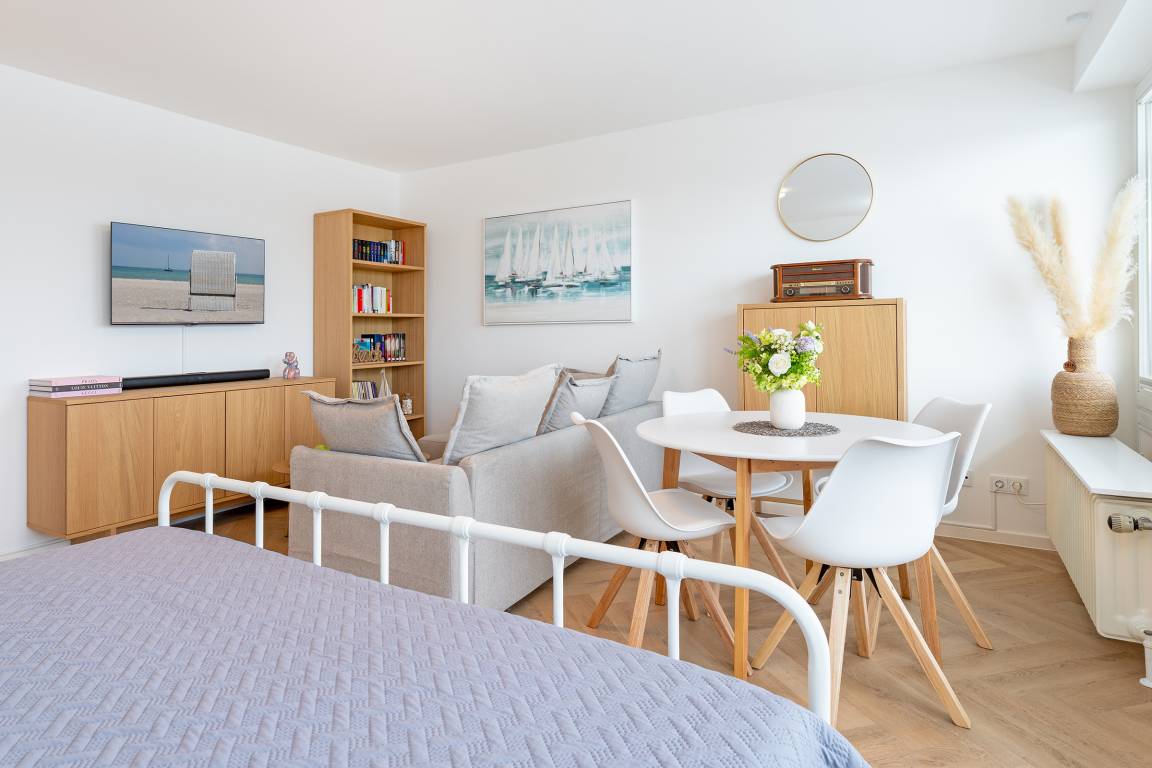 Der helle Wohn- und Schlafbereich ist freundlich eingerichtet und kombiniert Komfort mit Funktionalität. Ein bequemes Doppelbett sorgt für erholsame Nächte, während eine Sitzecke mit Fernseher und sogar einem Plattenspieler für entspannte Stunden nach einem Strandtag bereitsteht. Vom Wohnbereich gelangen Sie auf den Balkon, der mit Balkonmöbeln und einem Hängesessel ausgestattet ist und zum Frühstücken im Freien oder zum Ausklingen des Tages einlädt. Die kleine Küche verfügt über ein Kombi-Mikrowellen-Backofen, eine Kaffeemaschine, einen Kühlschrank sowie einem Wasserkocher – ideal, um sich während des Urlaubs selbst zu versorgen. Das Badezimmer ist mit Dusche, WC, Haartrockner und Kosmetikspiegel ausgestattet und bietet alles, was Sie für Ihre Urlaubstage benötigen.
