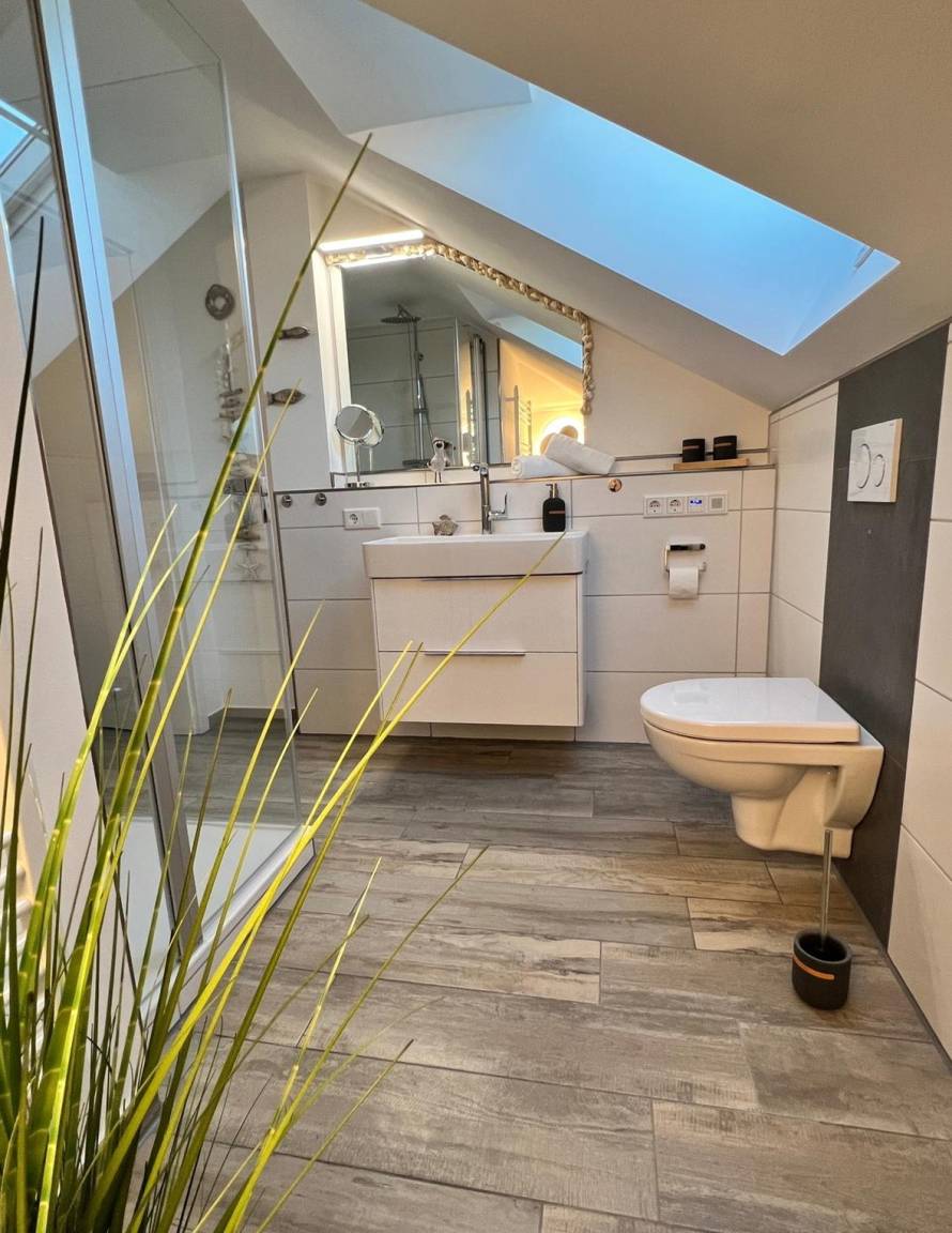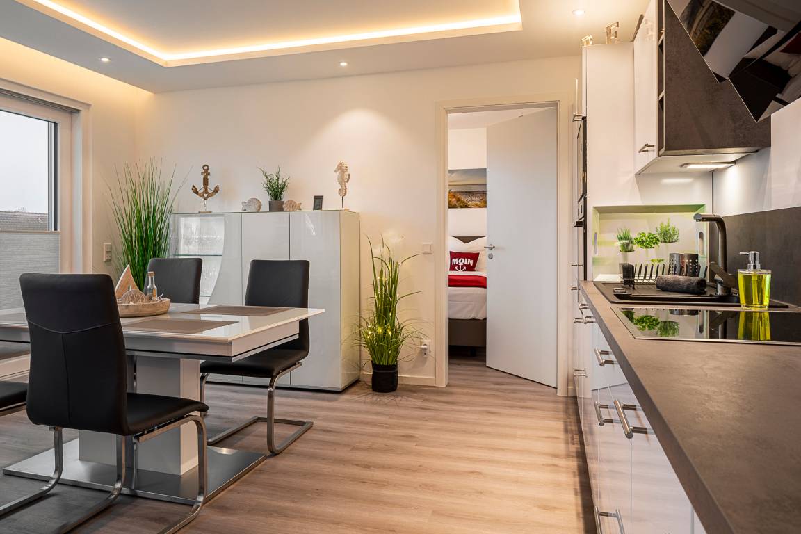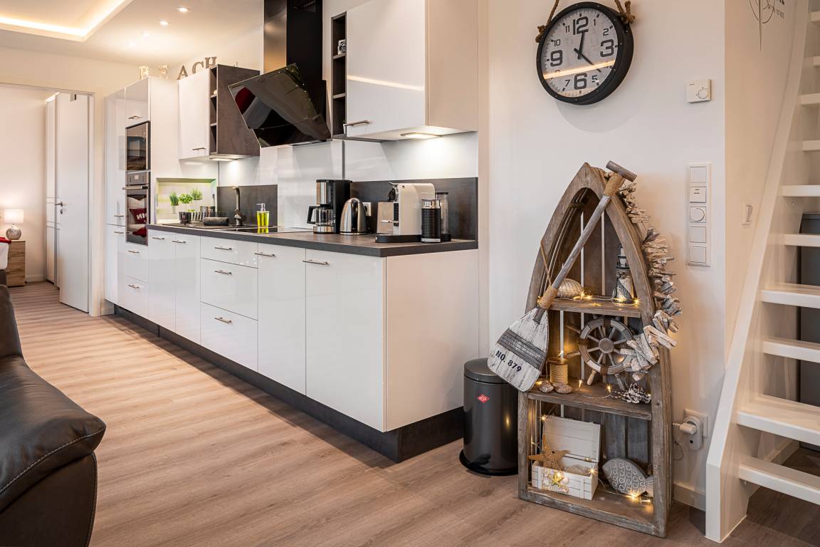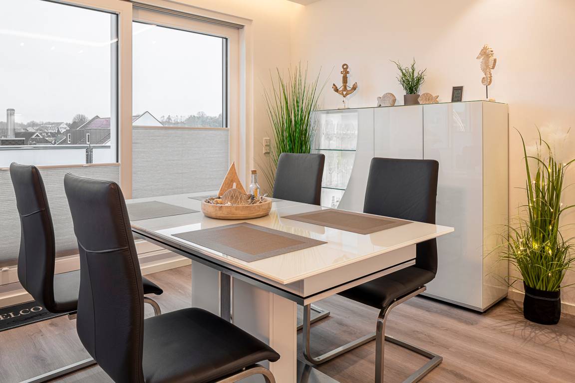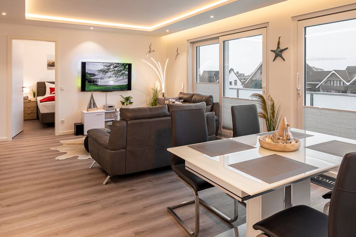 Die Wohnung ist modern und hochwertig eingerichtet. Der Wohn- und Essbereich ist komplett ausgestattet und verfügt über eine Küchenzeile mit Backofen, Cerankochfeld, Dunstabzug, Geschirrspüler, Kühlschrank mit Gefrierfach, Mikrowelle und Filterkaffeemaschine. Bodentiefe Fenster und elektrische Fensterrollläden sorgen für eine angenehme Atmosphäre. Vom Wohnbereich aus gelangt man auf die großzügige Dachterrasse mit Gartenmöbeln, von der aus man den Sonnenuntergang beobachten kann. Zur Unterhaltung stehen im Wohnbereich eine Stereoanlage mit Bluetooth und ein Fernseher zur Verfügung. Über eine Treppe gelangen Sie in das zweite Badezimmer, das mit einer Waschmaschine ausgestattet ist.