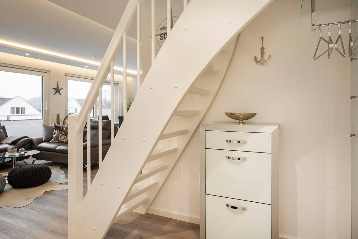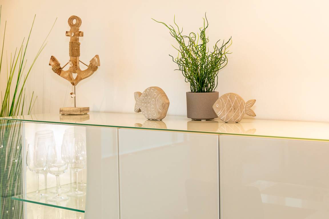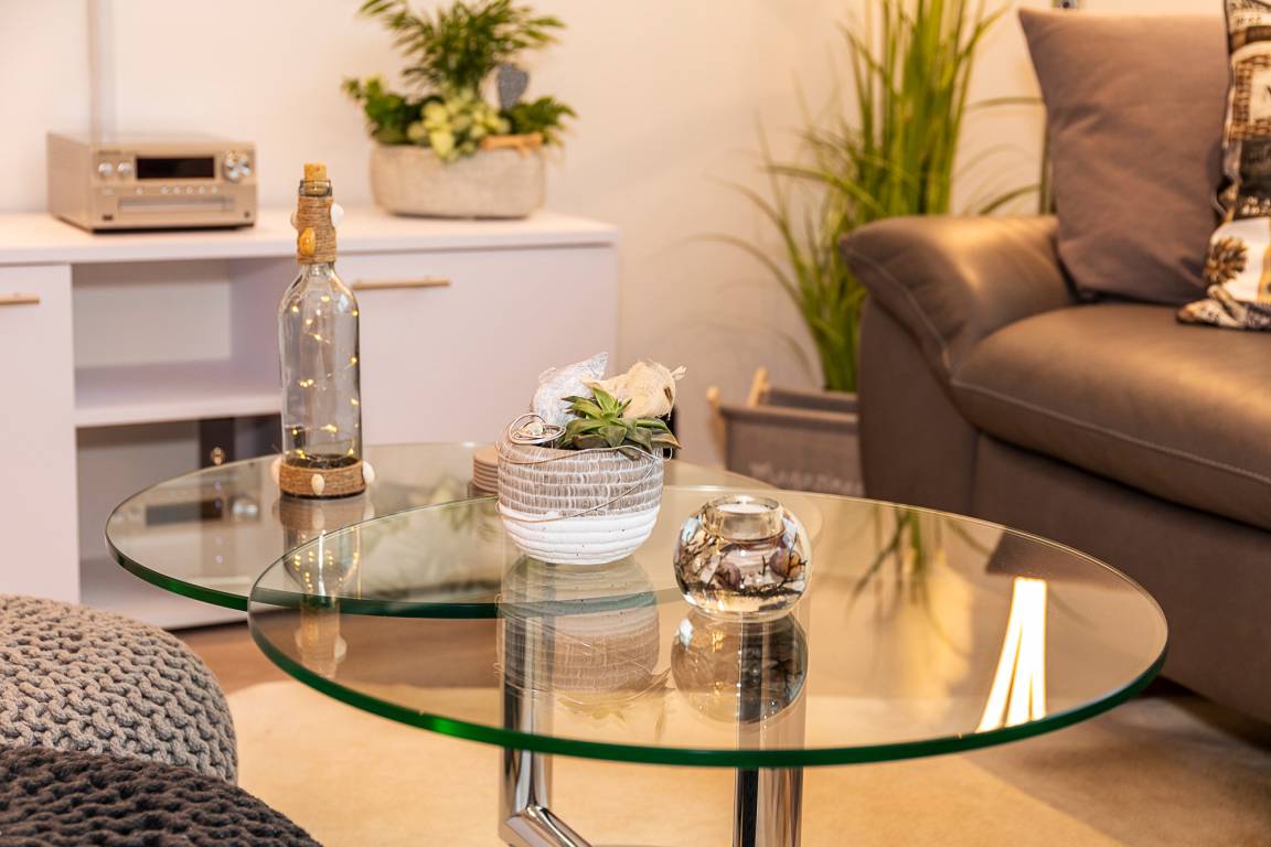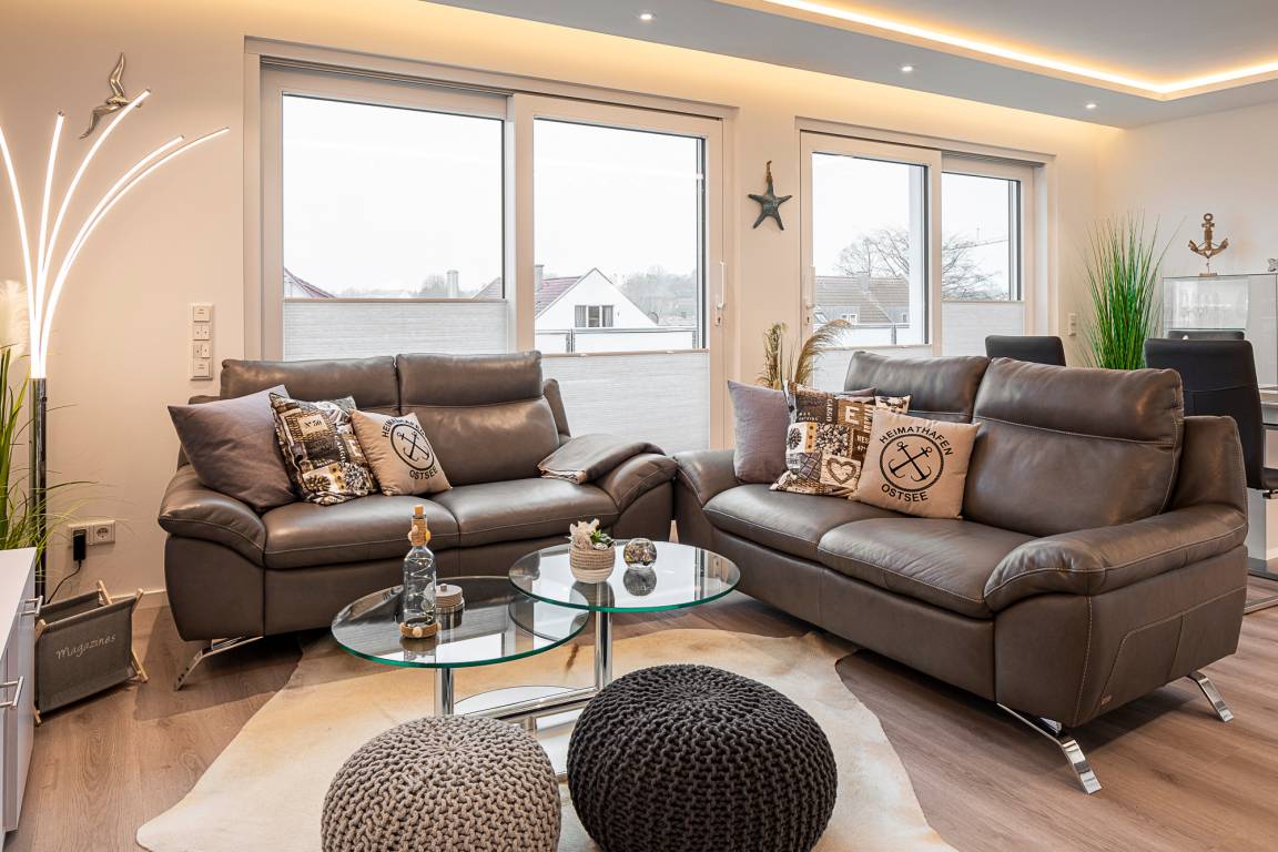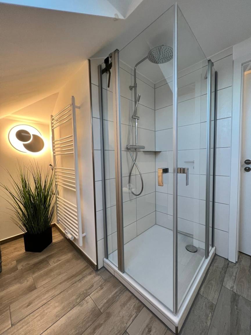 Die Wohnung ist modern und hochwertig eingerichtet. Der Wohn- und Essbereich ist komplett ausgestattet und verfügt über eine Küchenzeile mit Backofen, Cerankochfeld, Dunstabzug, Geschirrspüler, Kühlschrank mit Gefrierfach, Mikrowelle und Filterkaffeemaschine. Bodentiefe Fenster und elektrische Fensterrollläden sorgen für eine angenehme Atmosphäre. Vom Wohnbereich aus gelangt man auf die großzügige Dachterrasse mit Gartenmöbeln, von der aus man den Sonnenuntergang beobachten kann. Zur Unterhaltung stehen im Wohnbereich eine Stereoanlage mit Bluetooth und ein Fernseher zur Verfügung. Über eine Treppe gelangen Sie in das zweite Badezimmer, das mit einer Waschmaschine ausgestattet ist.
