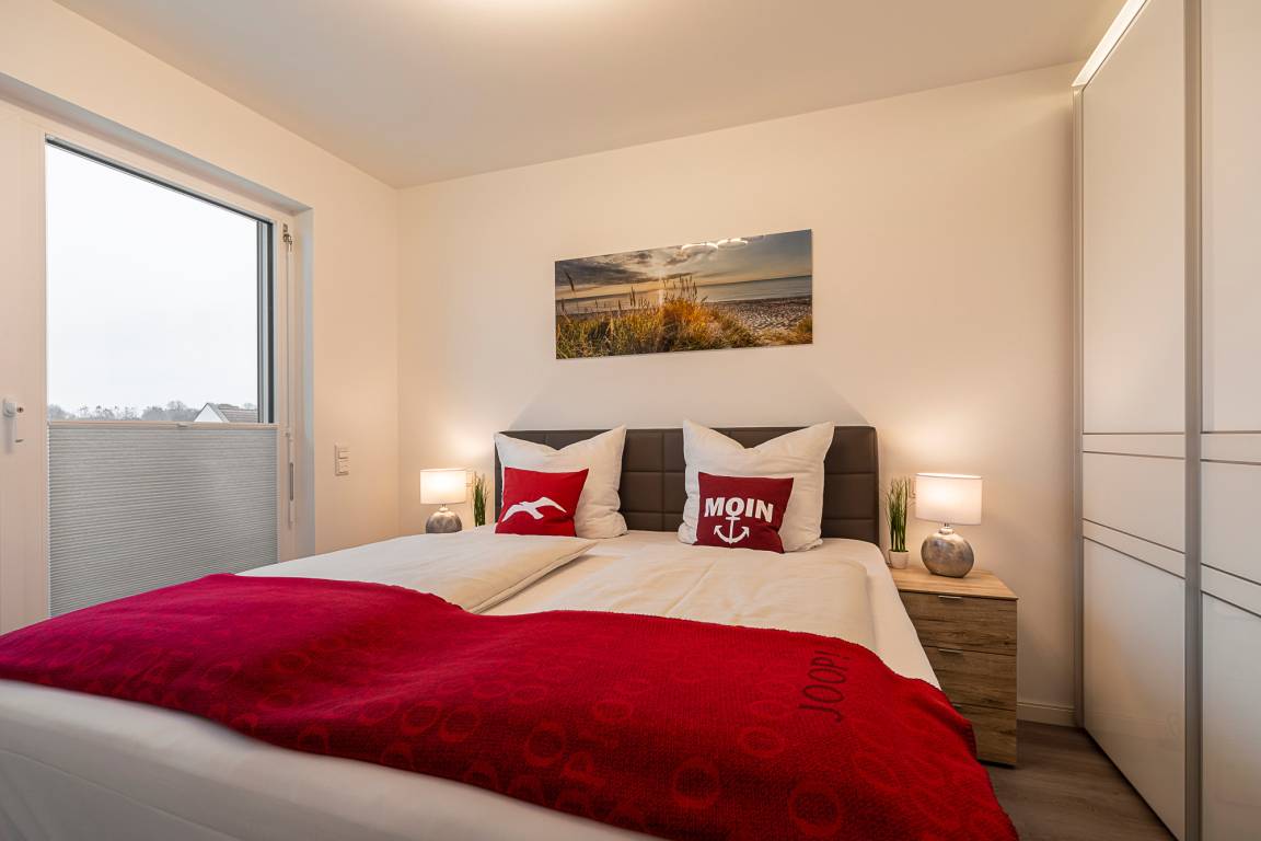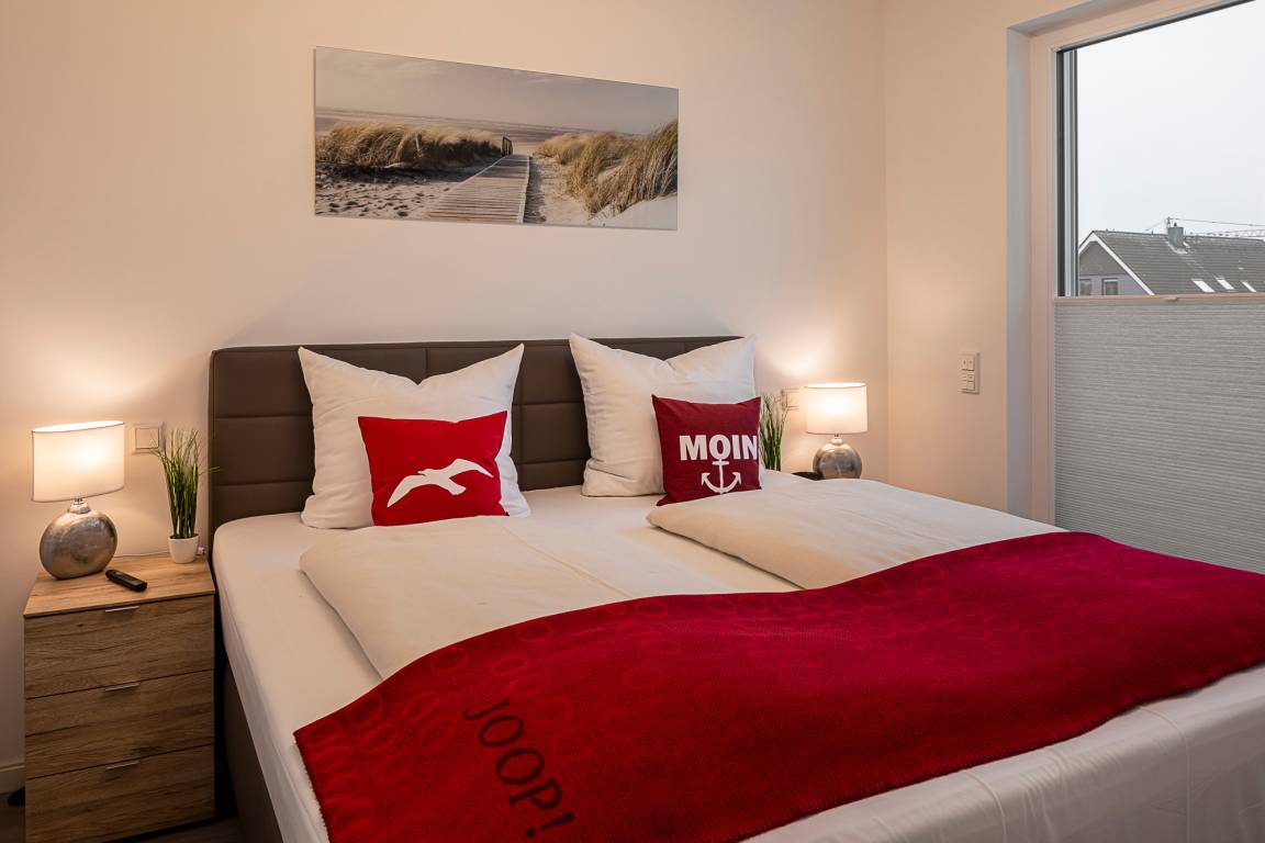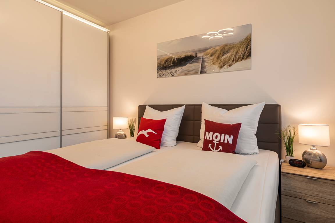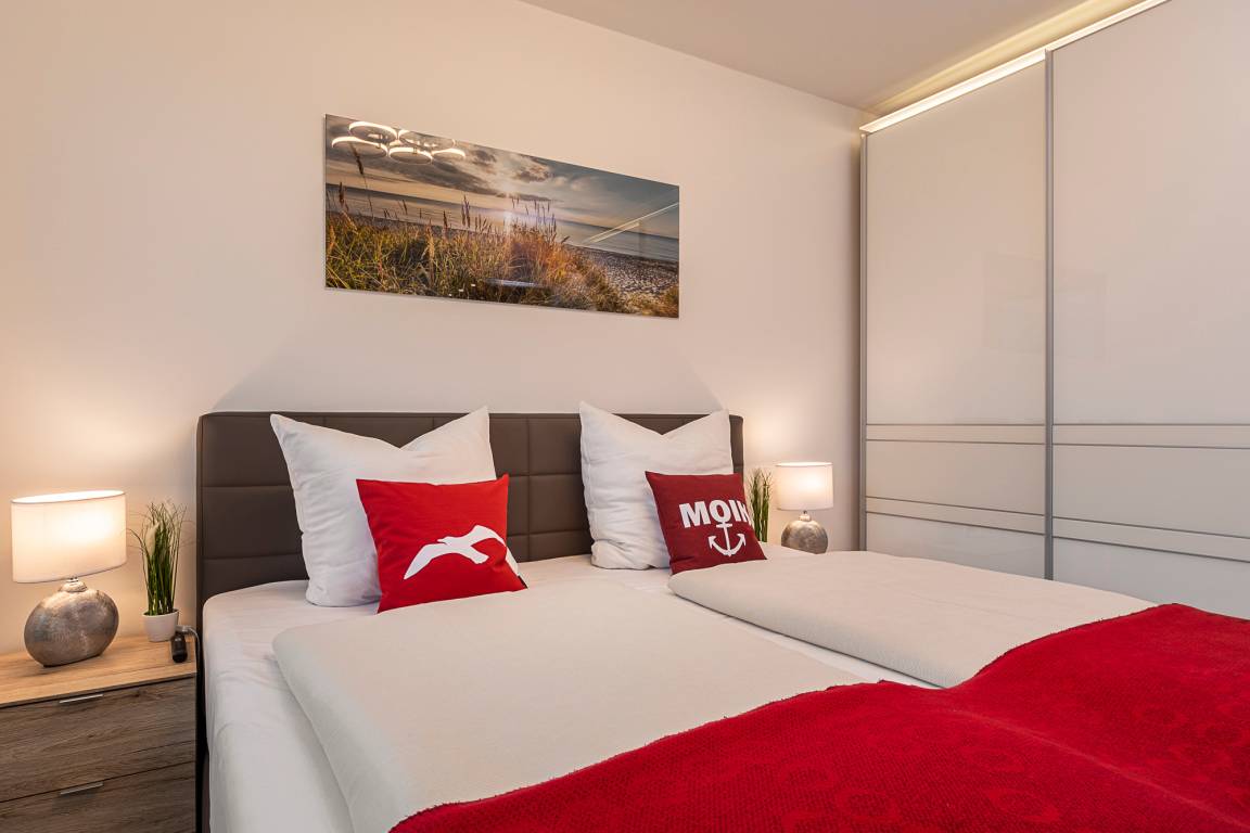 Beide Schlafzimmer sind mit einem Boxspringbett, zwei Nachttischen, einem Kleiderschrank und einem Fernseher ausgestattet. Außenrollläden sorgen für eine angenehme Nachtruhe. Das Duschbad bietet eine Dusche mit Hand- und Regendusche, einen Handtuchheizkörper, einen Fön und einen Kosmetikspiegel.
