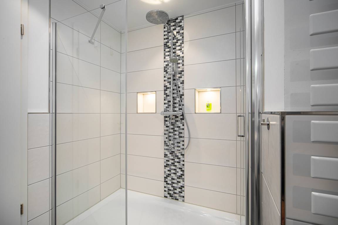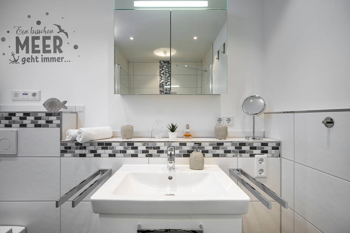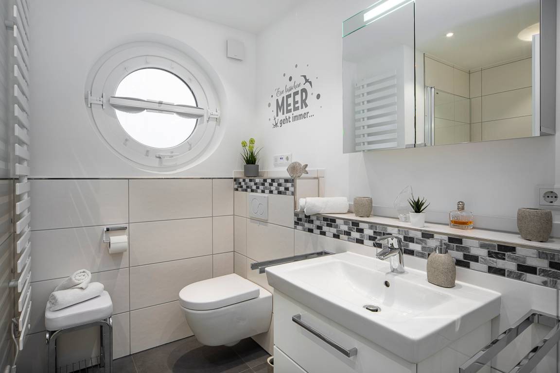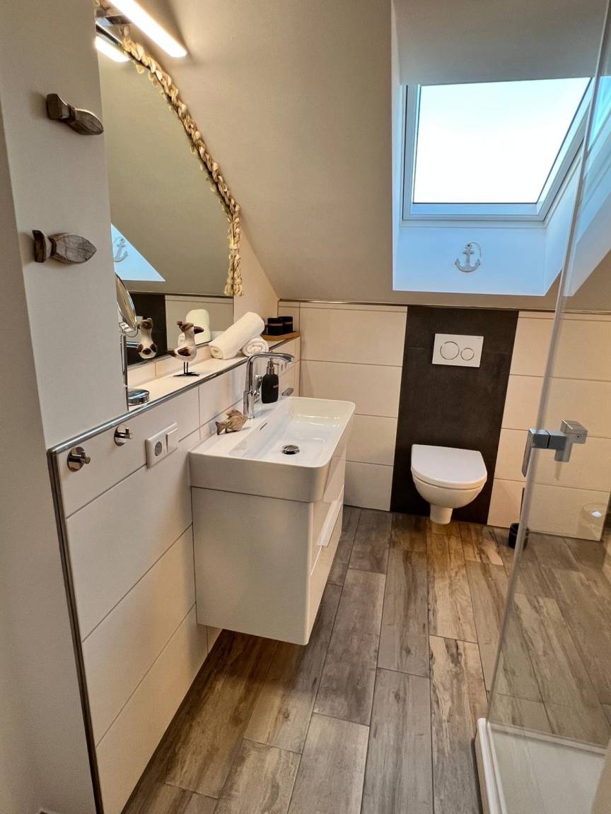 Beide Schlafzimmer sind mit einem Boxspringbett, zwei Nachttischen, einem Kleiderschrank und einem Fernseher ausgestattet. Außenrollläden sorgen für eine angenehme Nachtruhe. Das Duschbad bietet eine Dusche mit Hand- und Regendusche, einen Handtuchheizkörper, einen Fön und einen Kosmetikspiegel.