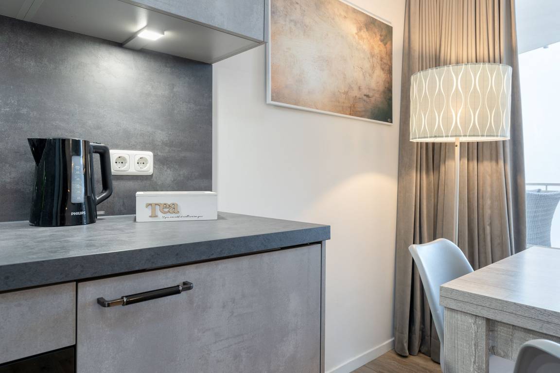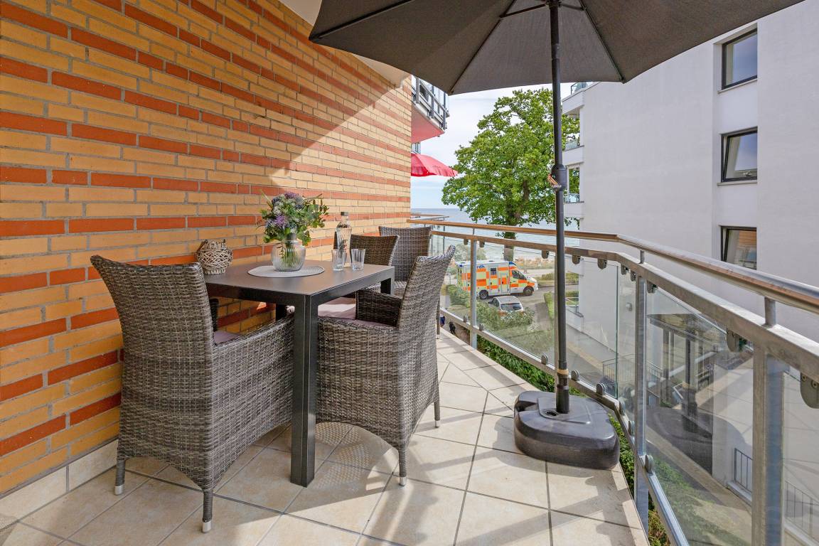 Die besondere Raumaufteilung schafft hier ein besonderes Flair: Die gemütliche Schlafcouch im schicken Wohn-/Essbereich kann zu einem Schlafplatz (160c200 cm) umgebaut werden. Machen Sie es sich auf dem Balkon gemütlich und verbringen Sie entspannte Stunden mit seitlichem Blick auf die Ostsee. In der offenen Einbauküche finden Sie alles, was Sie für das Zubereiten Ihrer Urlaubsmahlzeiten benötigen, die Sie anschließend am Esstisch gemeinsam einnehmen können. Das Schlafzimmer ist mit einem bequemen Boxspringbett (140x200 cm) ausgestattet - und durch ein Fenster vom Wohn-/Essbereich getrennt. Im hinteren kleinem Zimmer befindet sich Stauraum für Ihre Kleidung. Das moderne Duschbad sorgt für einen guten Start in den Tag.