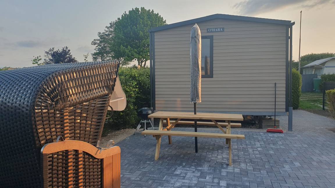 Unsere Mobilheime sind hell und modern ausgestattet und verfügen jeweils über einen kombinierten Wohn-/Essbereich mit integrierter Küchenzeile, 2-3 Schlafzimmern, 1-2 Bädern mit Dusche sowie 1-2 separaten WC. Eines der Bäder ist jeweils direkt von einem der Schlafzimmer aus zugänglich (en-suite). Auf der Terrasse stehen Ihnen ein eigener Strandkorb, ein Tisch mit Bänken und Sonnenschirm sowie ein Grill zur Verfügung. Ein kleiner Gartenbereich sorgt für weitere Entspannungsmöglichkeiten. Ihr Auto parken Sie direkt am Mobilheim.