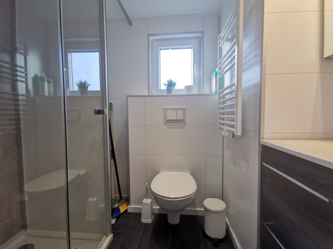 Im Bad befindet sich neben Dusche, Waschtisch und WC eine Handtuchheizung.