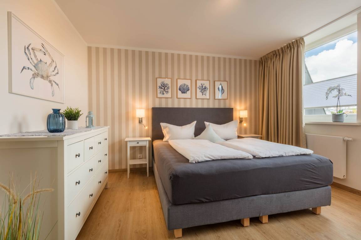 In der Cozy Up Strandsuite gibt es ein Schlafzimmer mit Boxspring-Doppelbett und eine kuschelige