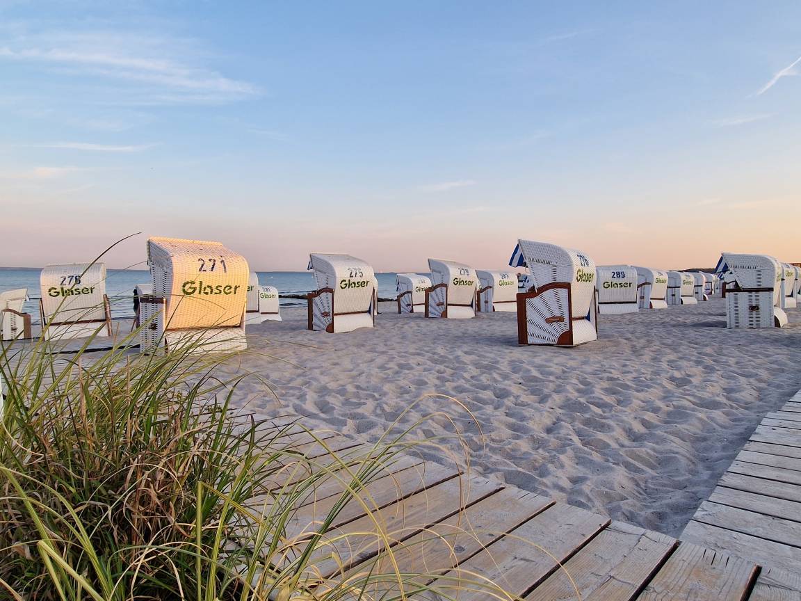 Die mit Kastanienzaun eingezäunte Terrasse mit Gartenmöbel und Strandkorb rundet das Angebot ab.