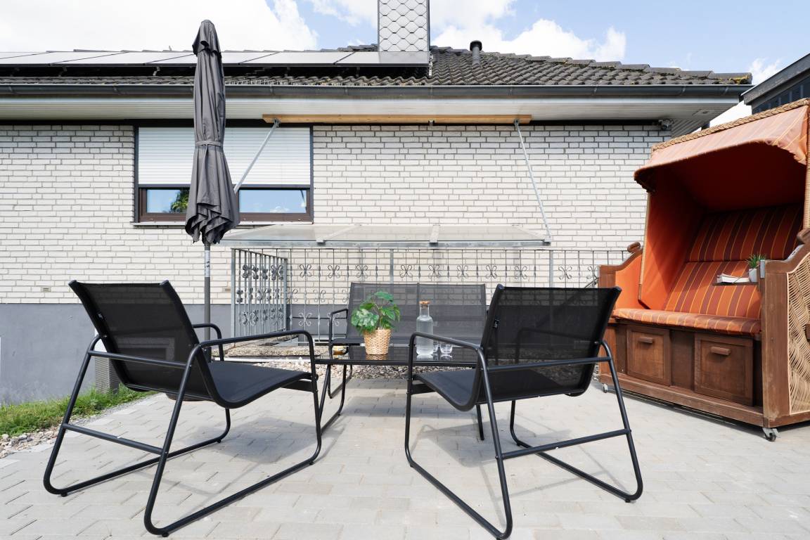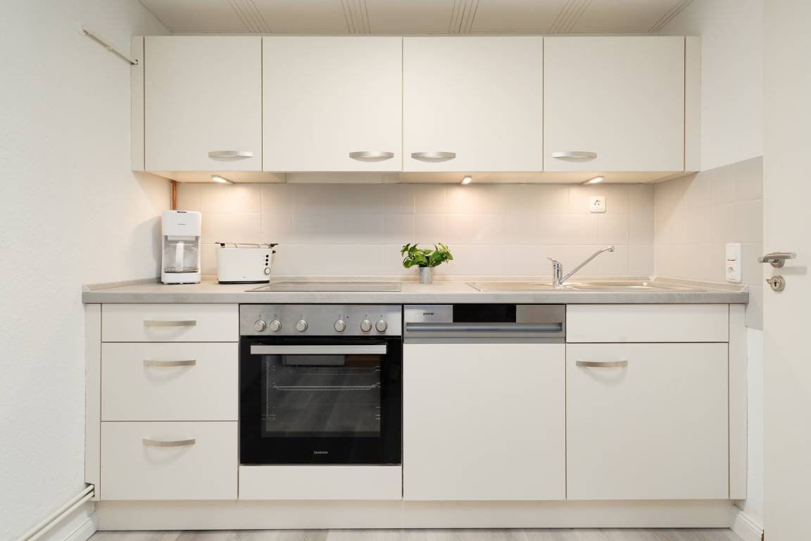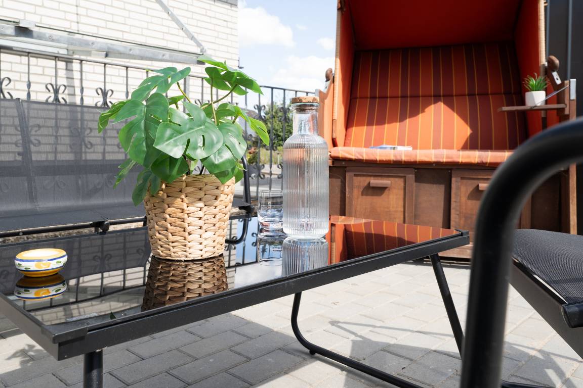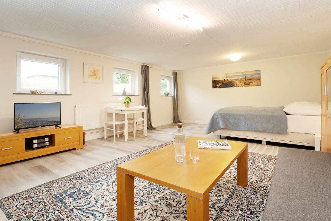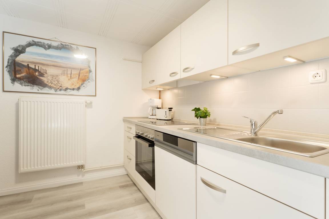 Das kleine Küstennest empfängt Sie mit einem kombinierten Wohn- und Schlafbereich, der mit einem bequemen Sofa, einem TV-Gerät sowie einer liebevoll eingerichteten Sitzecke ausgestattet ist – ideal für entspannte Urlaubsstunden. Die Terrasse mit eigenem Strandkorb lädt zum Verweilen an der frischen Luft ein. Die separate Küche ist umfassend ausgestattet mit Cerankochfeld (4 Felder), Backofen, Geschirrspüler, Kühlschrank mit Gefrierfach, Mikrowelle, Kapselmaschine (Nespresso), Eierkocher und Toaster – hier können Sie nach Herzenslust Ihre Urlaubsspeisen zubereiten. Der angrenzende Essbereich bietet Platz für gemeinsame Mahlzeiten.
