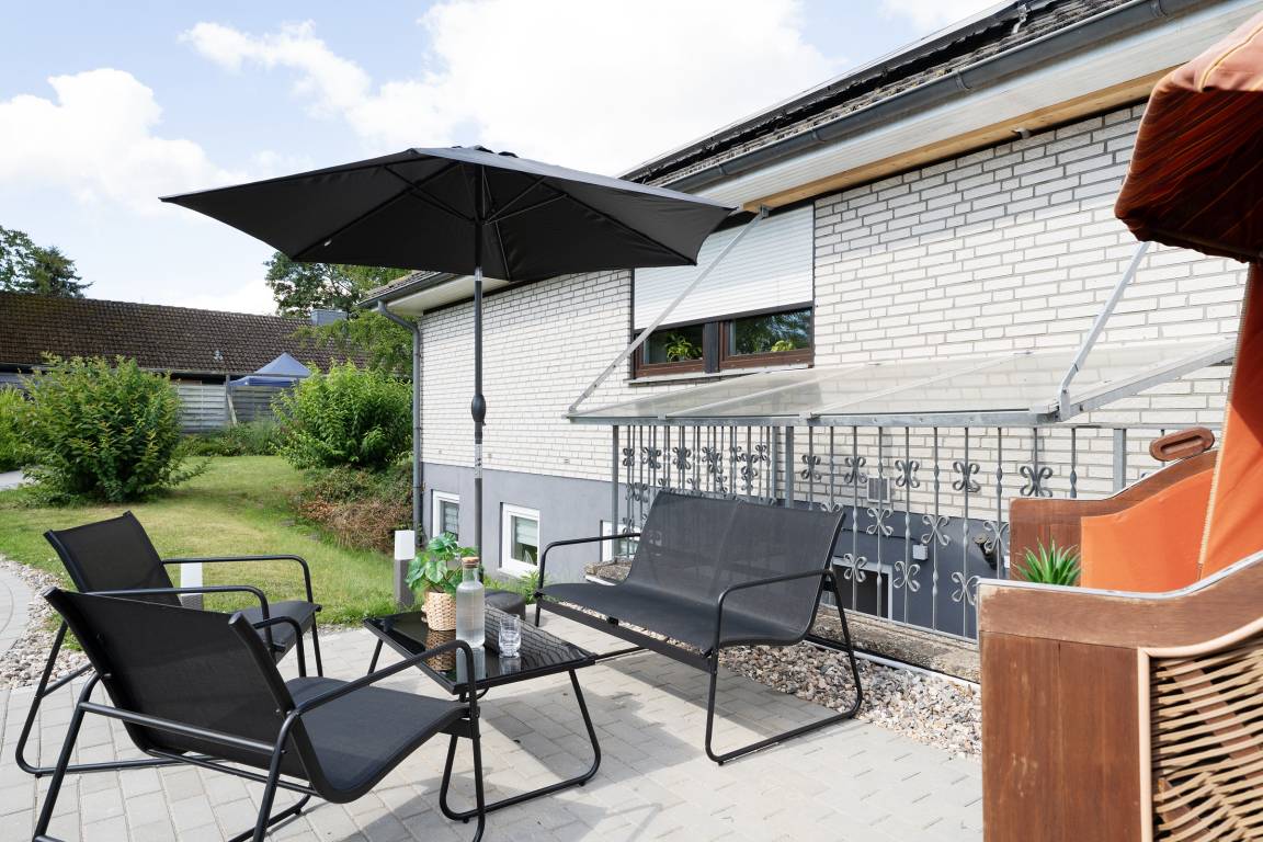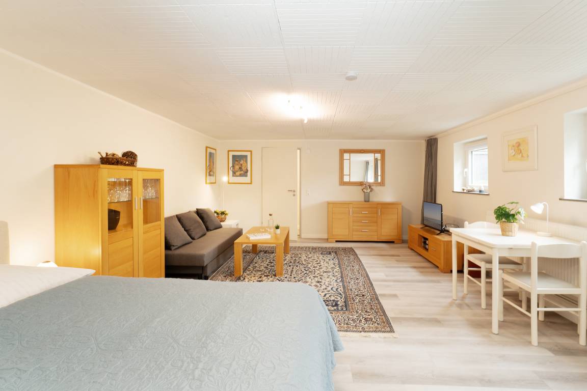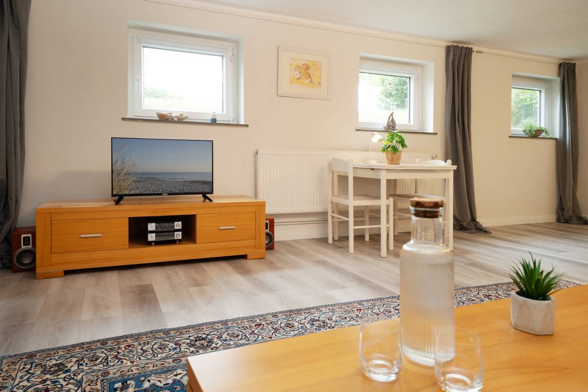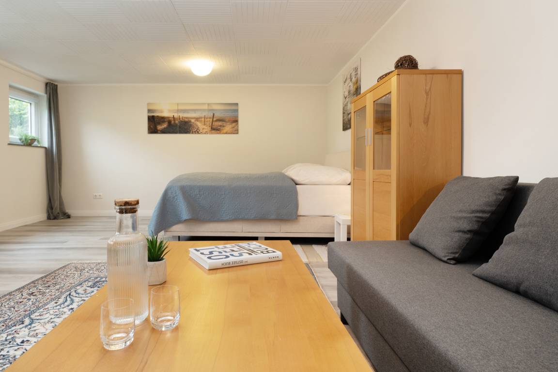 Großzügige 1-Zimmer-Souterrain-Ferienwohnung für bis zu zwei Personen in Schashagen-Beusloe mit 57 m² Wohnfläche und großer Terrasse mit herrlichem Blick ins Grüne.