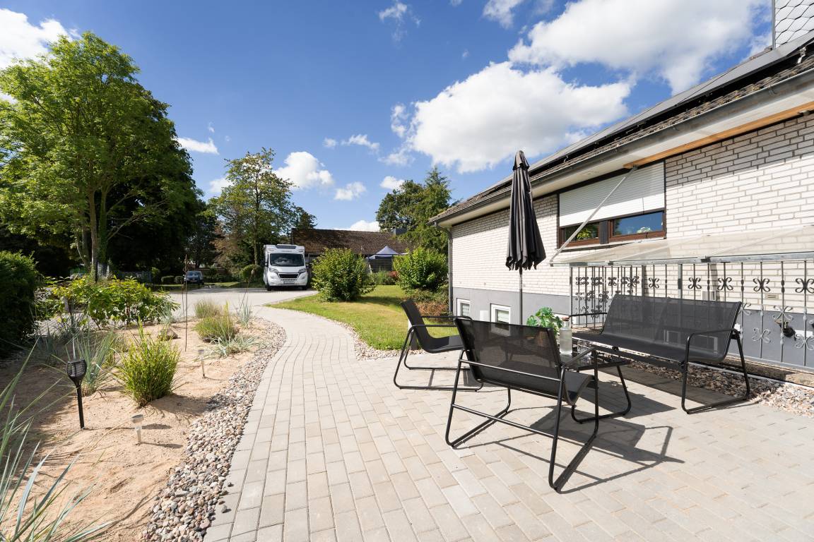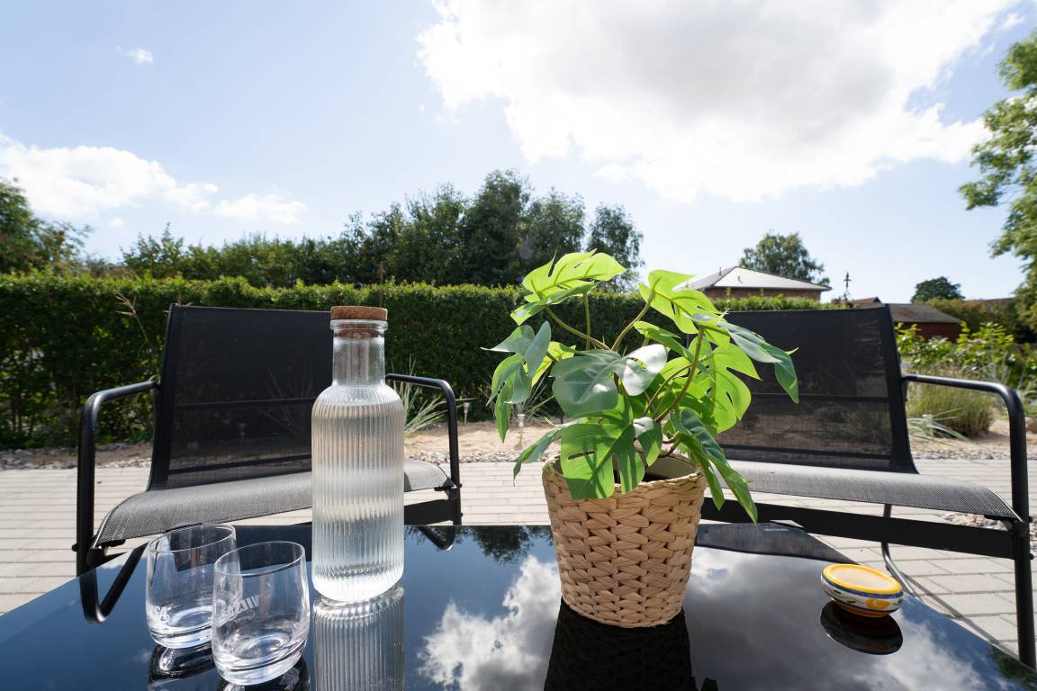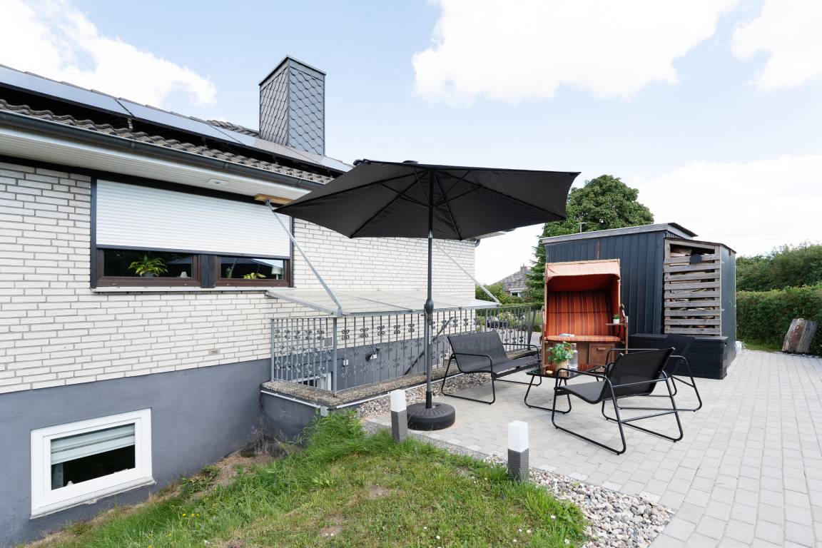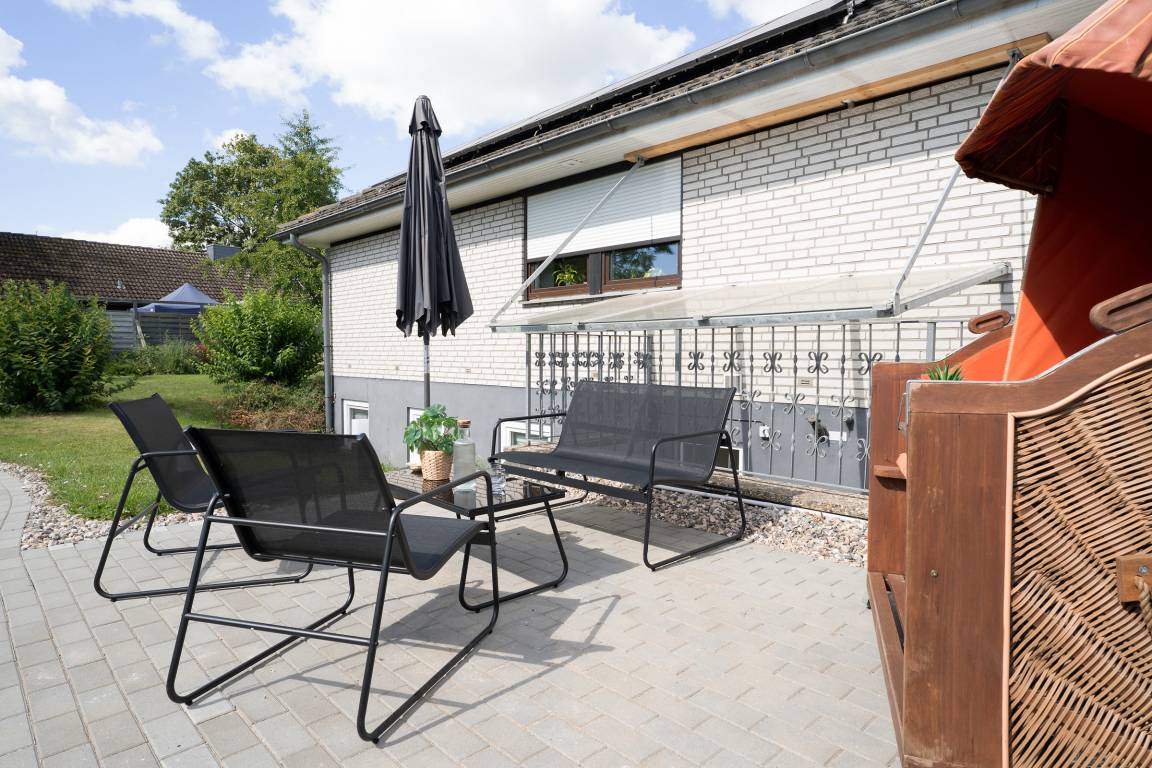 Großzügige 1-Zimmer-Souterrain-Ferienwohnung für bis zu zwei Personen in Schashagen-Beusloe mit 57 m² Wohnfläche und großer Terrasse mit herrlichem Blick ins Grüne.