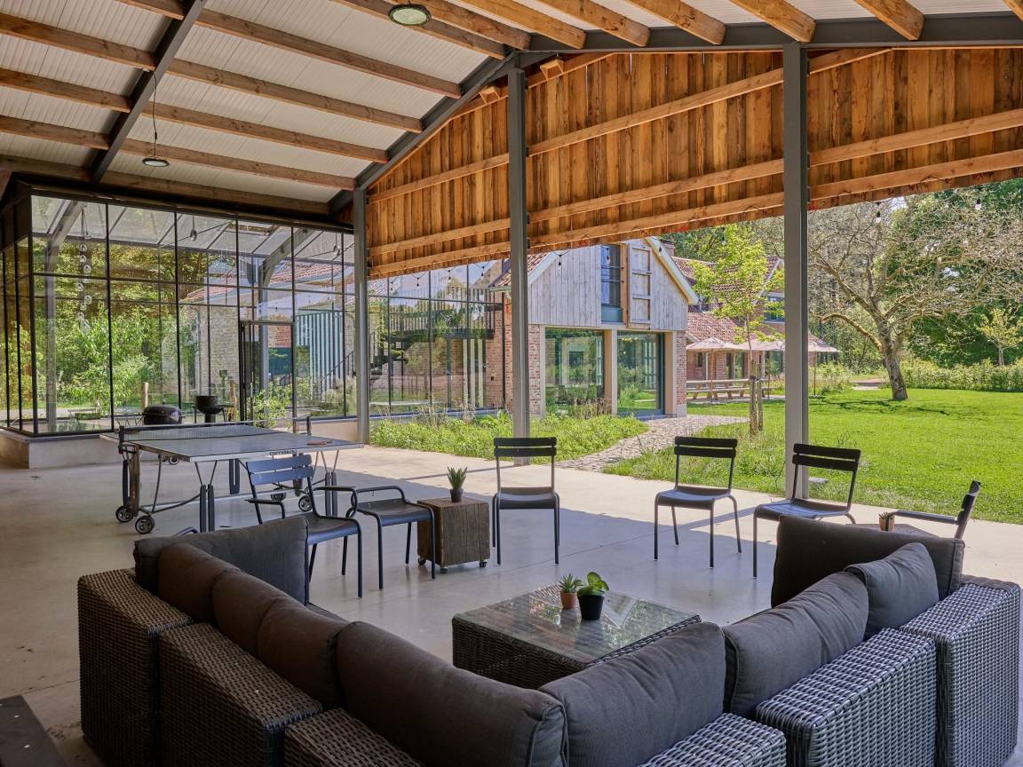 Hausbeschreibung : Natürlicher Charme und dauerhafter Luxus vereinen sich in diesem einzigartigen Ferienhaus für 2 oder 3 Familien. Mit 6 geräumigen Schlafzimmern, gemütlichen Wohnzimmern, einer großen Küche, einem Spielzimmer, einem Wintergarten und einem großen Garten bietet es viel Platz zum Zusammensein und zum Rückzug. Rundherum gebaut und stilvoll eingerichtet mit recycelten Materialien - jedes Detail erzählt eine Geschichte. Perfekt für entspanntes, sinnvolles Beisammensein in einer charaktervollen Umgebung