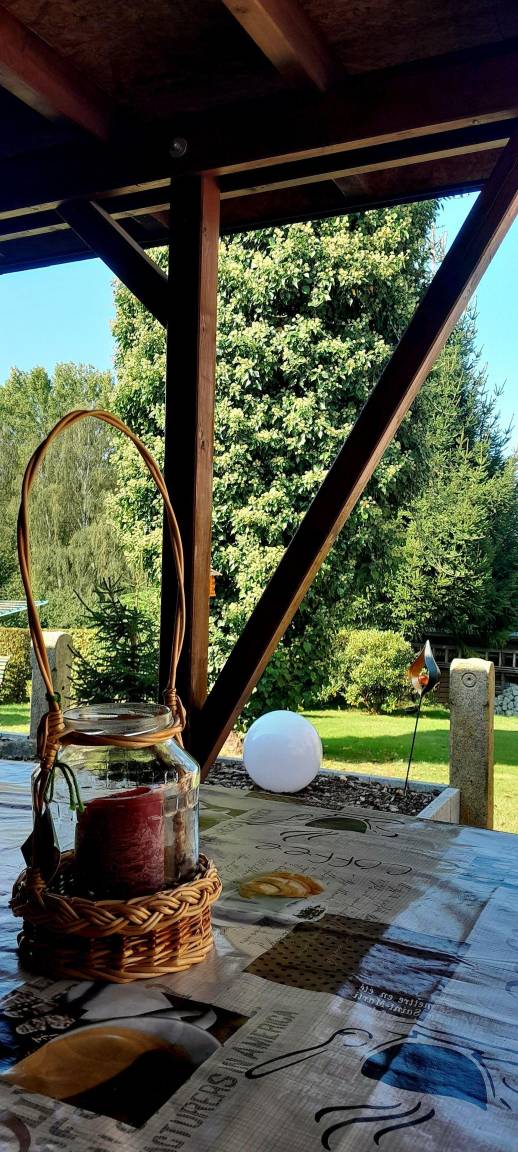 Im Garten befindet sich eine überdachte Sitzecke mit Auflagen und einer Grillmöglichkeit.