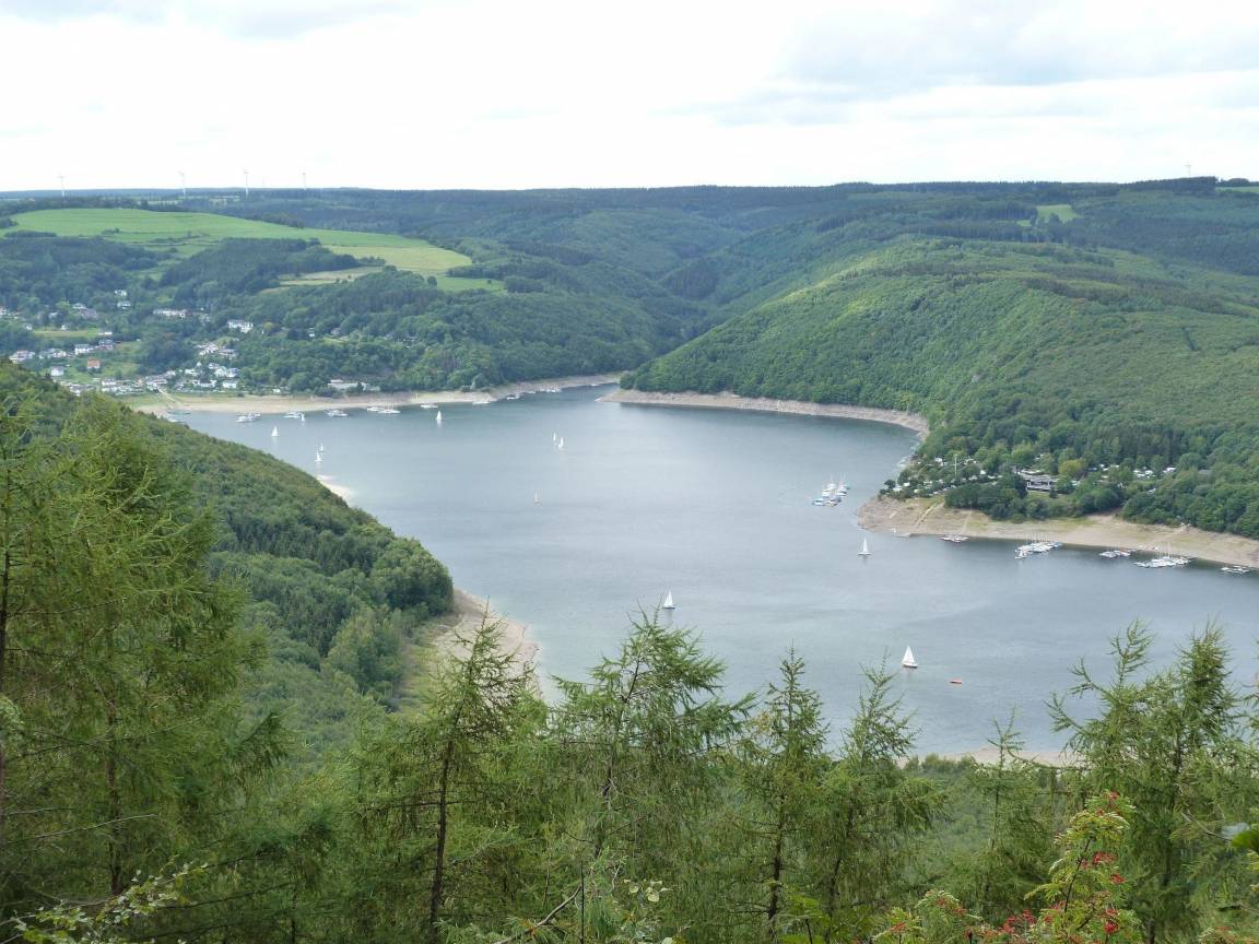 -Rurtalsperre mit angrenzender Ufttalsperre, mit Schiffsverkehr zwischen Einruhr, Rurberg Schwammenauel,