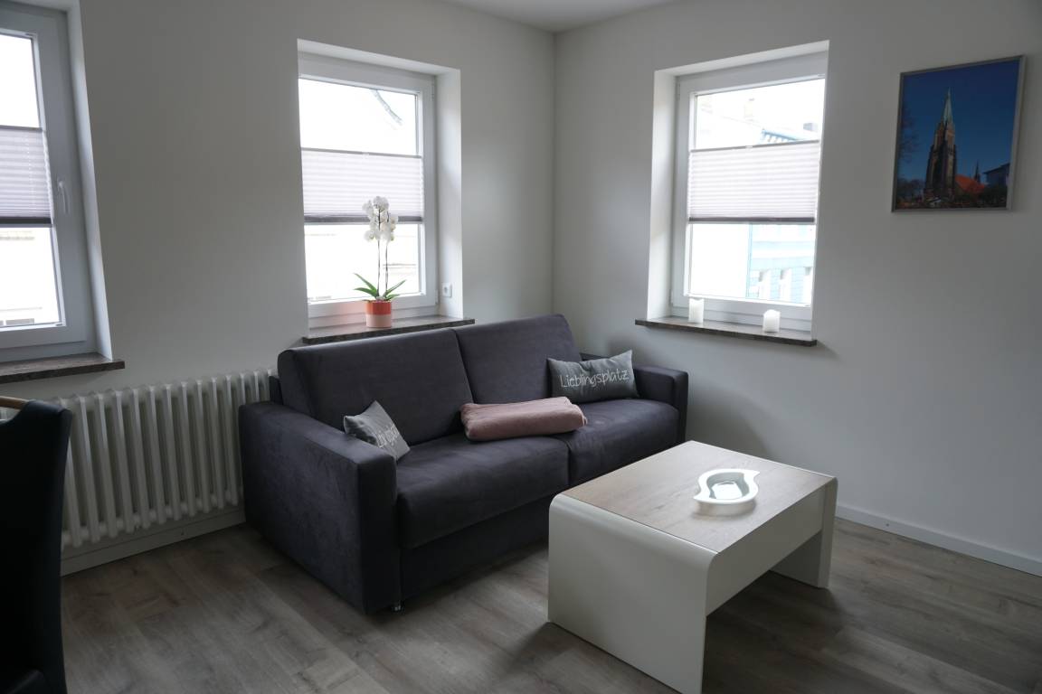Genießen Sie erholsame Tage in der liebevoll und modern eingerichteten Ferienwohnung. Die Wohnung liegt im Obergeschoss einer Doppelhaushälfte aus dem Jahr 1898, welche im Jahr 2020 komplett saniert wurde. Bei der Gestaltung der Ferienwohnung wurde auf Helligkeit und eine sehr gute Ausstattung geachtet. Im Eingangsbereich steht Ihnen ein Garderobenschrank zur Verfügung. Das Wohnzimmer ist mit einem gemütlichen Sofa (Komfort-Schlafsofa) mit Couchtisch und einem Medienboard nebst TV und Radio/CD ausgestattet. Ein Esstisch mit drei Stühlen komplettiert den Wohnbereich. Das ruhige Schlafzimmer ist mit einem Doppelbett (1,80 x 2,00) mit Ablagen und Leselampen sowie einem großen Kleiderschrank ausgestattet. Die Küche ist mit einem Herd mit Backofen und Dunstabzug, einer Geschirrspülmaschine und einer Kühl-Gefrierkombination bestens ausgestattet. Kleingeräte wie Kaffeemaschine, Wasserkocher und Toaster runden die hervorragende Ausstattung ab. Im Tageslichtbad stehen Ihnen ein Waschtisch mit Unterschrank und einem Spiegelschrank, eine Dusche mit fester Abtrennung, ein WC und ein Handtuchheizkörper zur Verfügung. Im Außenbereich stehen Ihnen eine Terrasse mit Gartenbestuhlung und einem Grill zur Verfügung. Ihren PKW können Sie auf dem Grundstück abstellen. Fahrräder können im abschließbaren Abstellraum untergestellt werden. Für E-Bikes gibt es dort eine Lademöglichkeit. Auf Wunsch können Fahrräder für eine geringe Gebühr beim Vermieter ausgeliehen werden.