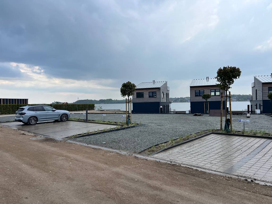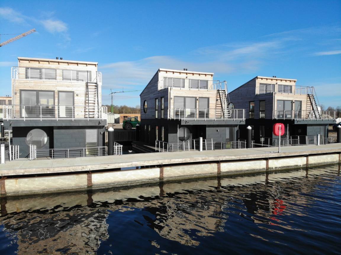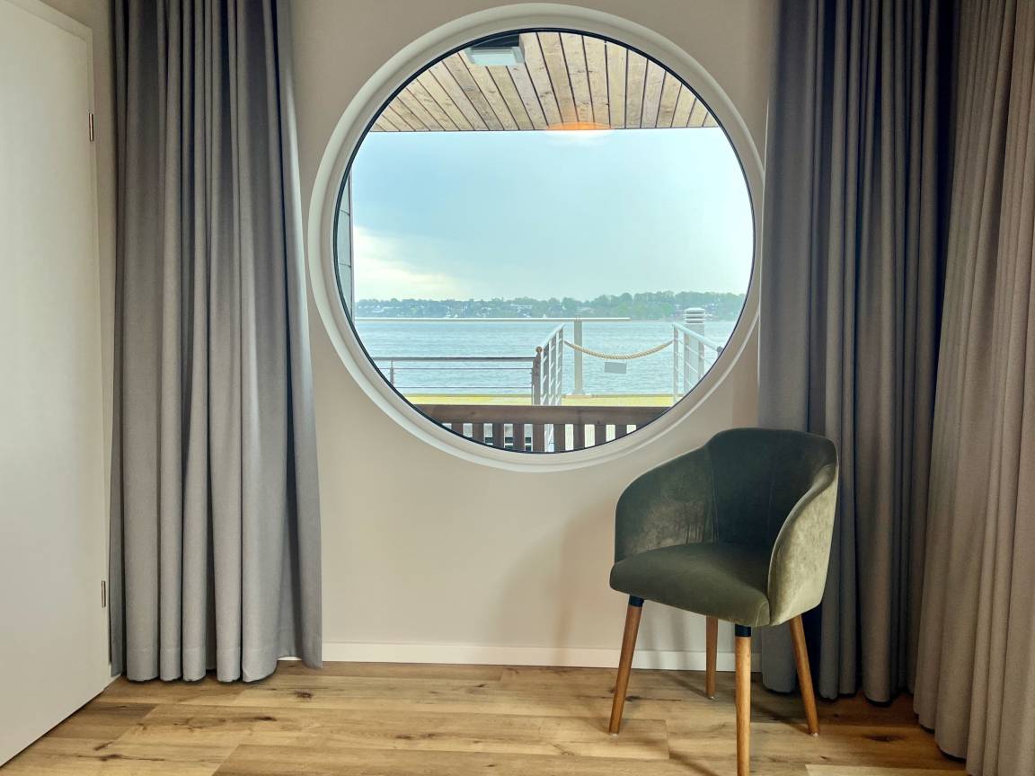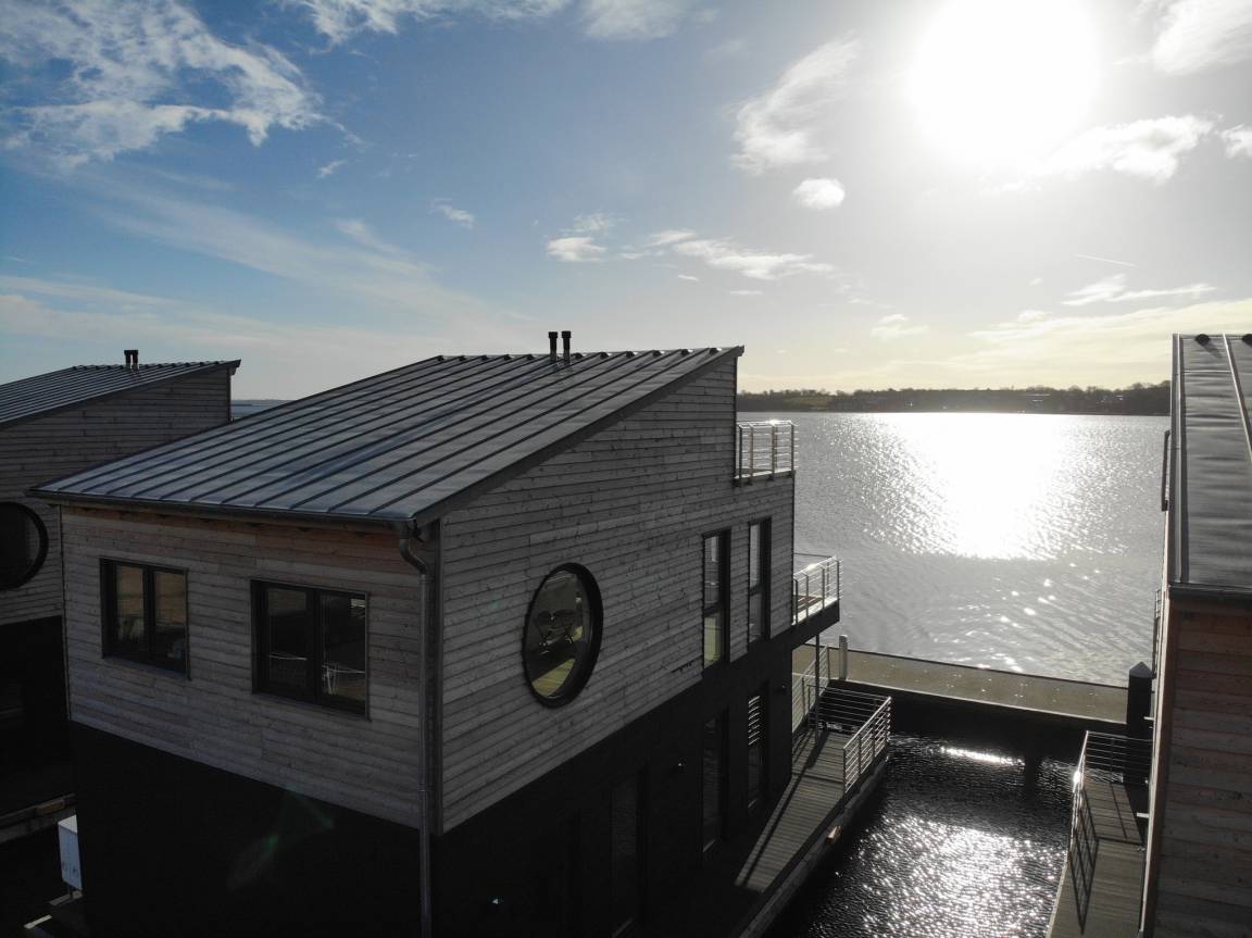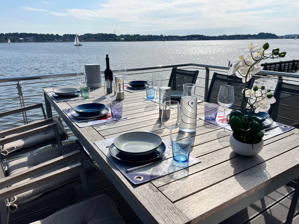 Willkommen im Wasserhaus Freiheit, dem schwimmenden Ferienhaus auf der Schlei, mit eigenem traumhaftem Blick auf das Wasser und eigenem Bootsliegeplatz vor der Haustür.