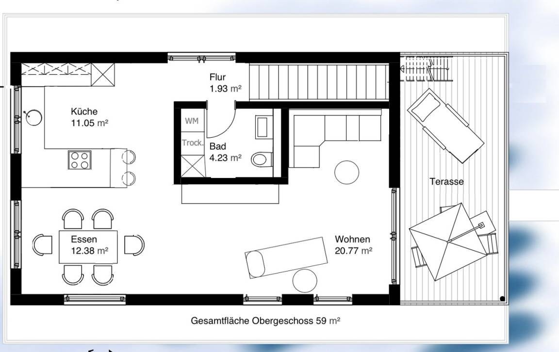 Im Obergeschoss ein offener Bereich Küche, Essbereich und Wohnecke mit traumhaftem Blick auf die Schlei. Von den zwei Terrassen lässt sich der Ausblick besonders gut genießen.