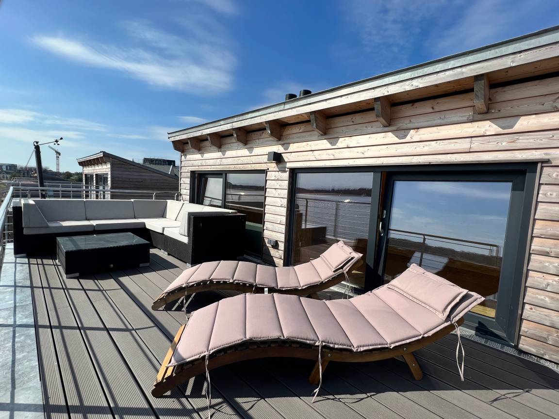 Wasserhaus Freiheit – Urlaub direkt auf der Schlei – Genießen Sie den freien Blick aufs Wasser und Ihren eigenen Bootsliegeplatz. Das stilvolle, schwimmende Ferienhaus bietet auf 150 qm Platz für bis zu sechs Personen. Mit zwei Doppelbetten und einem Etagenbett ist es optimal eingerichtet für fünf Erwachsene und ein Kind oder auch vier Erwachsene und zwei Kinder. Mit einer offenen Wohnküche und zwei Terrassen ist es ideal für unvergessliche Momente am Wasser.