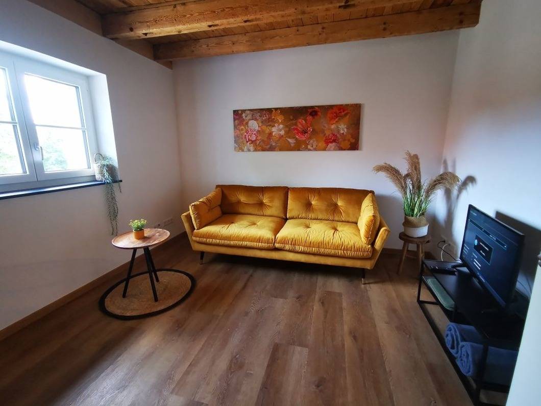 Im offenen Wohnraum befindet sich ein TV-Flat-Fernseher.