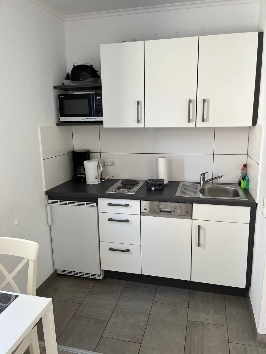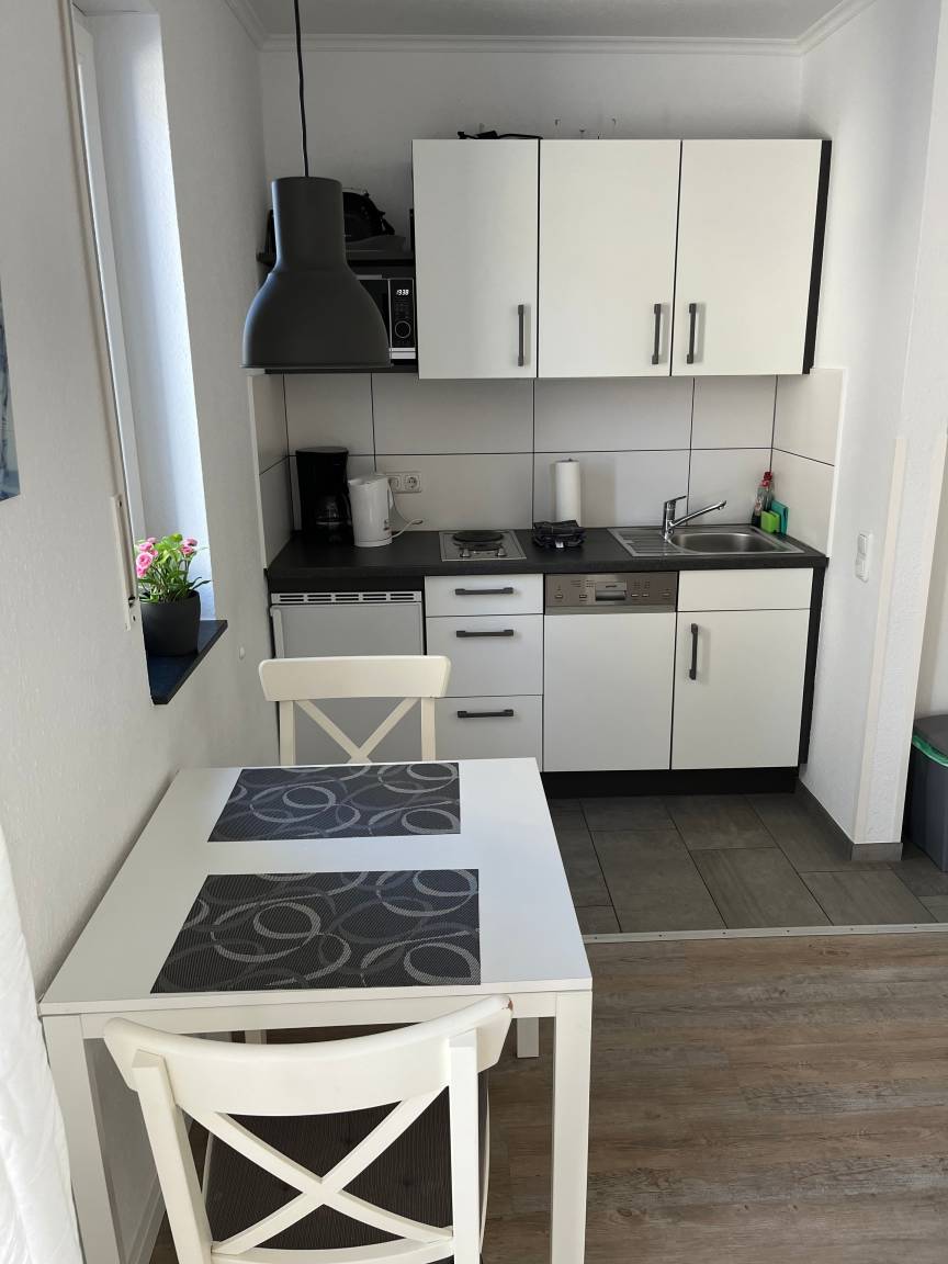Ausstattung der Küche: Geschirrspüler, Kühlschrank, Mikrowelle, Herd, Wasserkocher, Toaster und Kaffeemaschine, Esstisch mit 2 Sitzplätzen.
