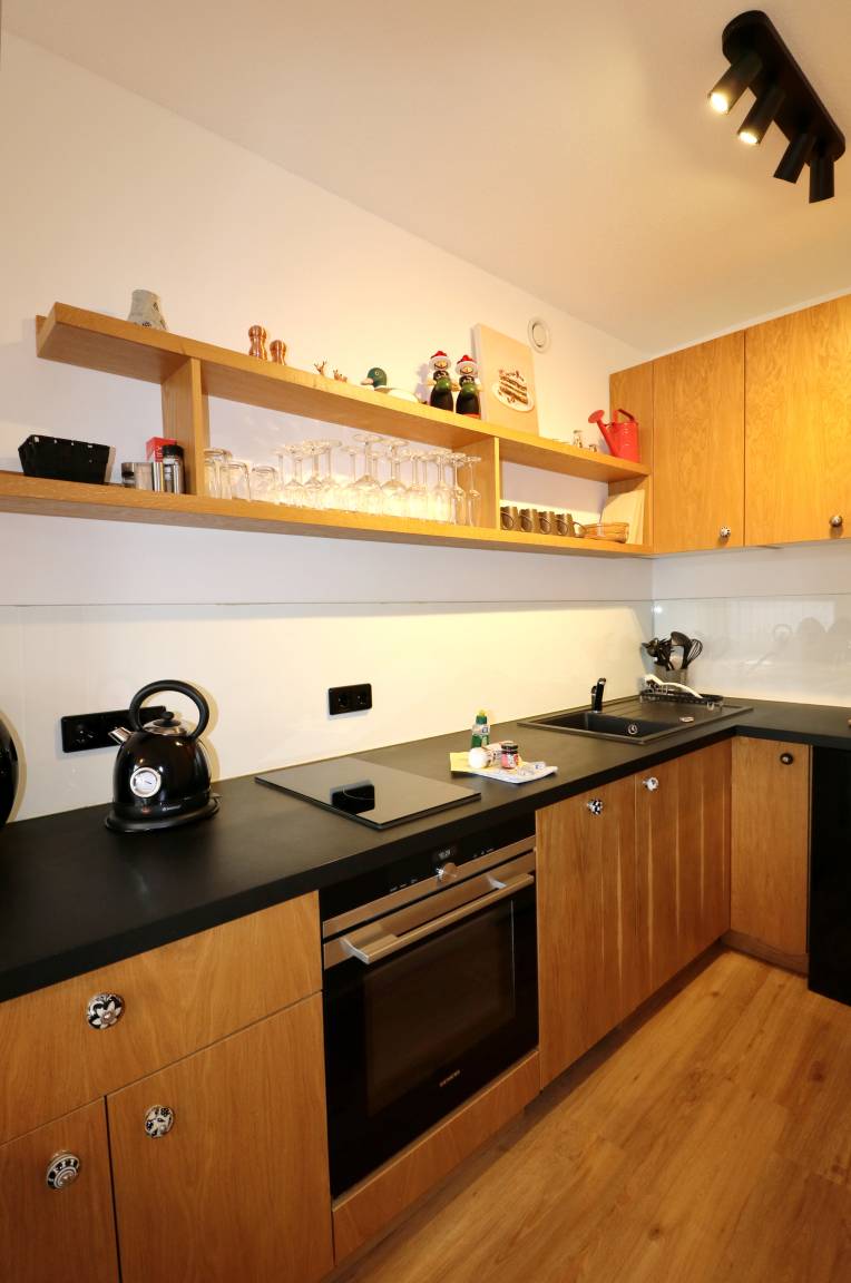 - an open-plan kitchenette with fridge incl. freezer compartment, ceramic hob, dishwasher, oven, kettle, toaster, Dolce Gusto capsule coffee machine and basic kitchen equipment