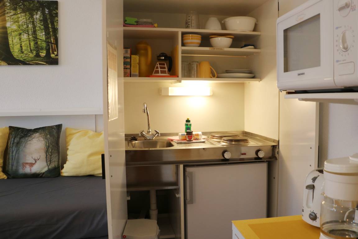 - die Pantryküche ist ausgestattet mit einem Herd (2 Kochfeldern), Kühlschrank mit Gefrierfach, Filter- Kaffeemaschine, Toaster, Wasserkocher, Mikrowelle, Geschirr und Besteck und Küchengrundutensilien