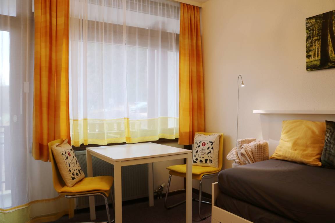 - ein Wohnschlafzimmer mit einem ausziehbaren Doppelbett (160x200 cm), hochwertigen Matratzen in allergikerfreundlichen Encasings, TV, Essplatz mit Waldblick zum Riesenbühl und einer praktischen Pantryküche