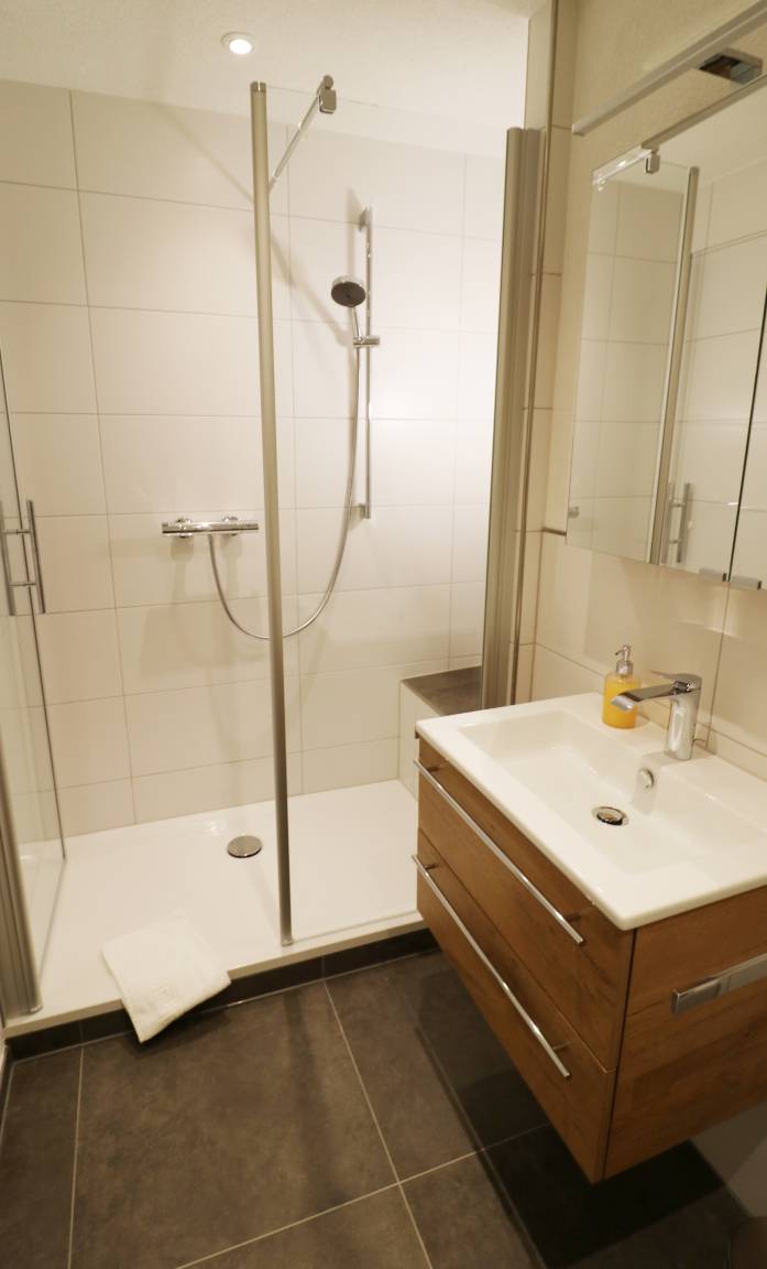 - ein Bad mit Dusche, Waschbecken, WC, Föhn